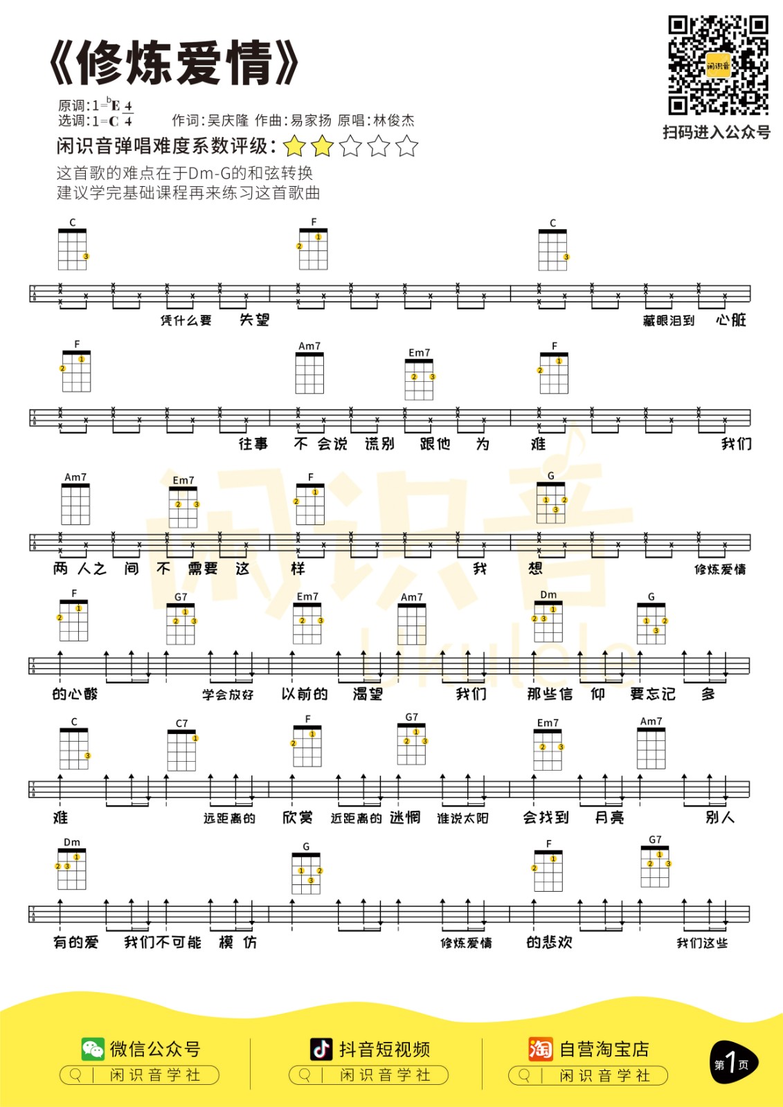 林俊杰《修炼爱情》尤克里里曲谱-C调弹唱谱...