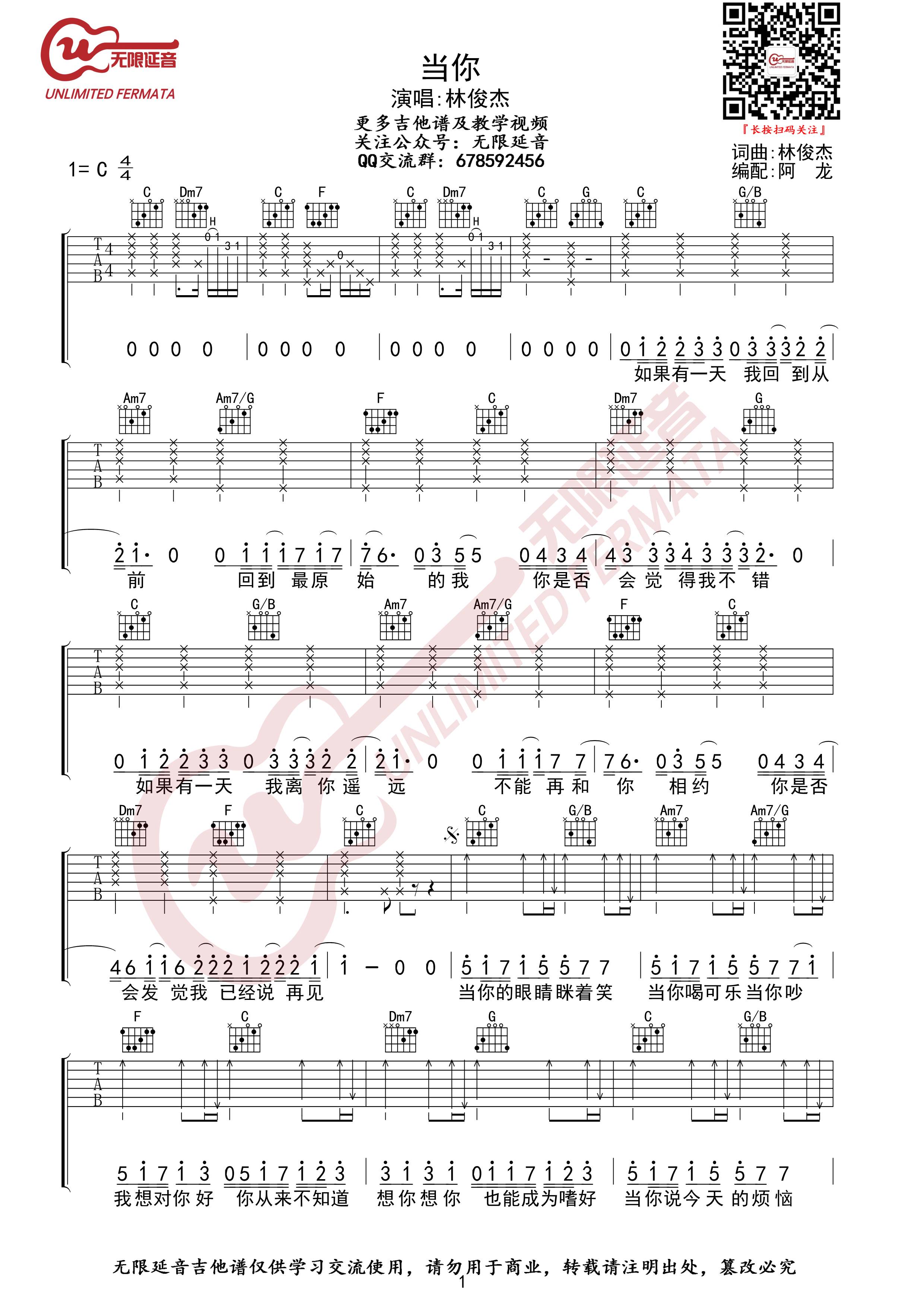 吉他林俊杰《当你》吉他谱_C调指法编配六线谱_无限延音