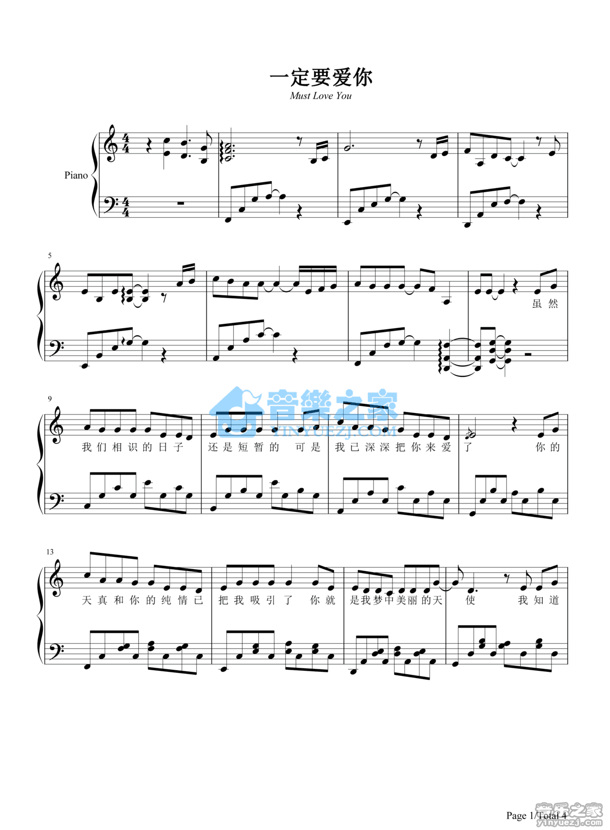 钢琴完整版 田一龙《一定要爱你》钢琴五线谱