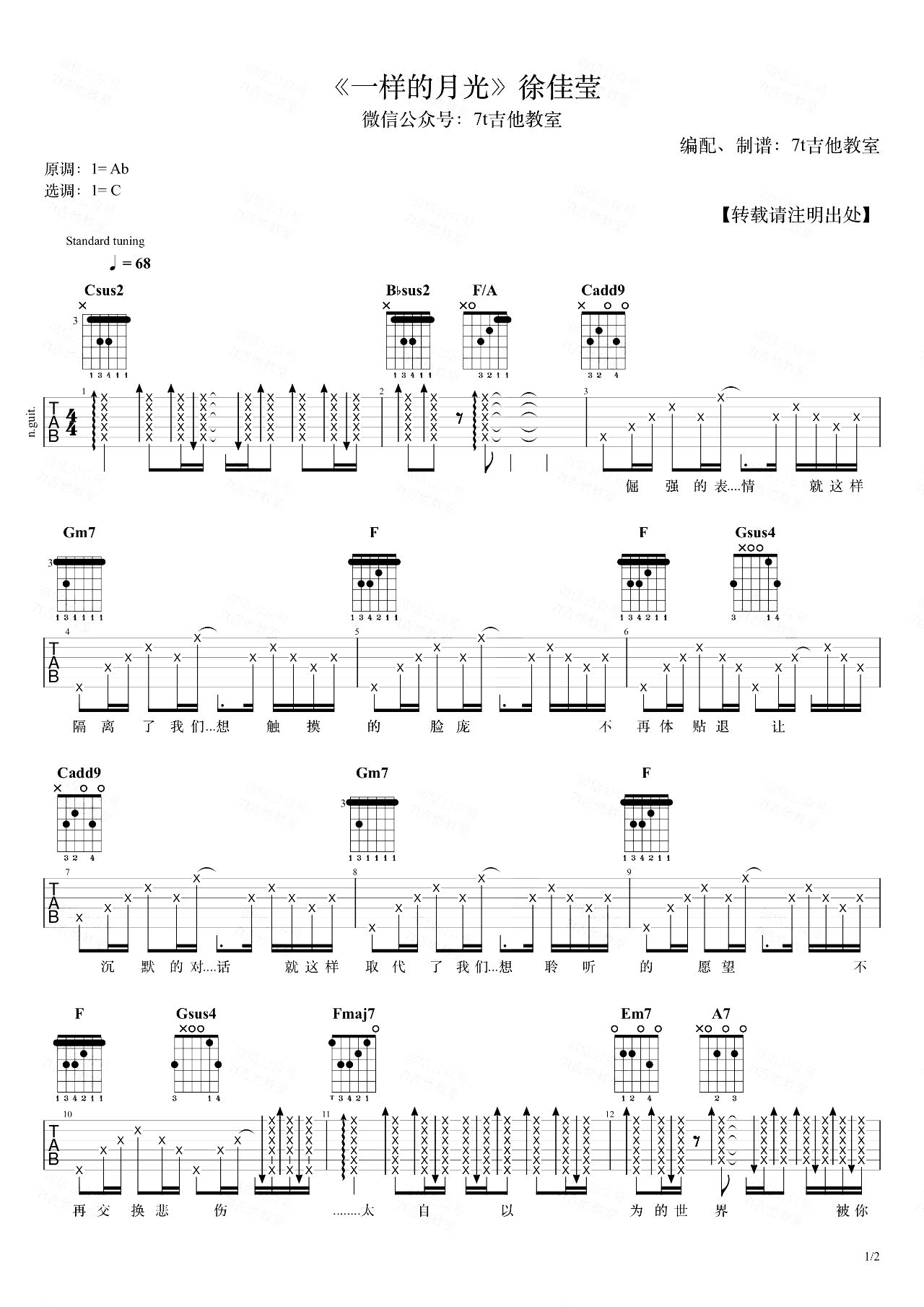 一样的月光吉他谱_徐佳莹_C调这首歌的和弦编配没有太多可以讲的,可以留意一下副属和弦的运用“A7→Dm7“,还有歌曲结尾的四级小和弦Fm,都是比较常见的和弦用法。...