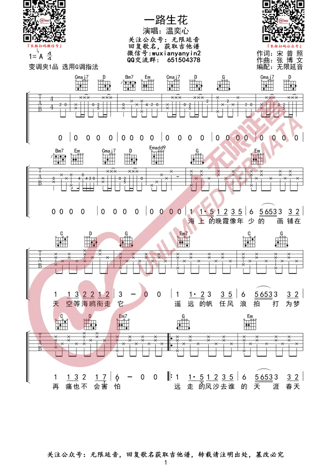 吉他温奕心《一路生花》吉他谱-G调弹唱谱高清六线谱