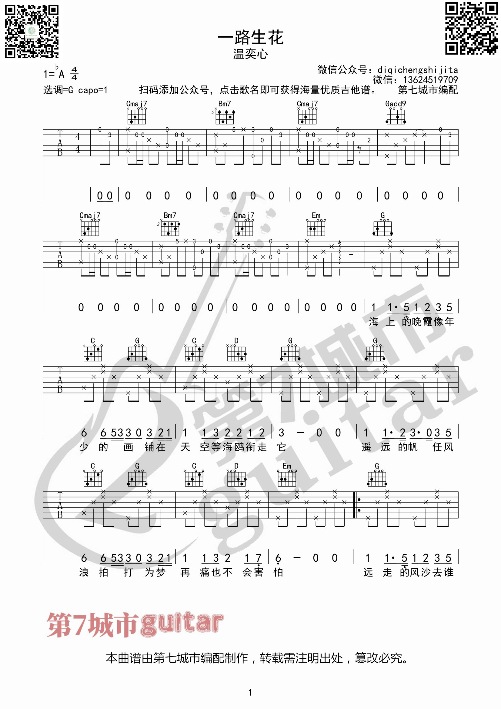 吉他温奕心《一路生花》吉他谱_吉他弹唱谱_第七城市编配