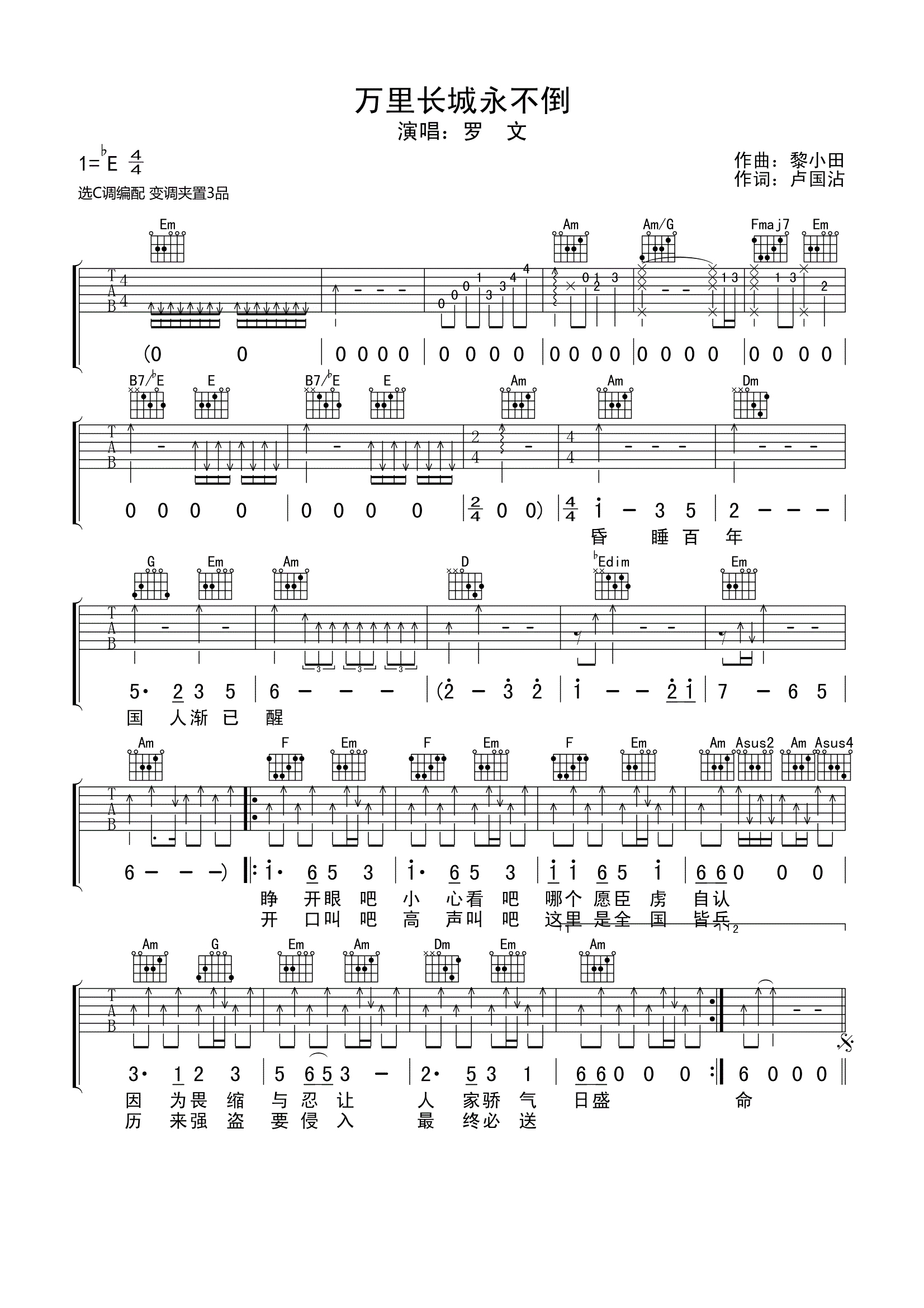 吉他罗文《万里长城永不倒》吉他谱_吉他弹唱谱