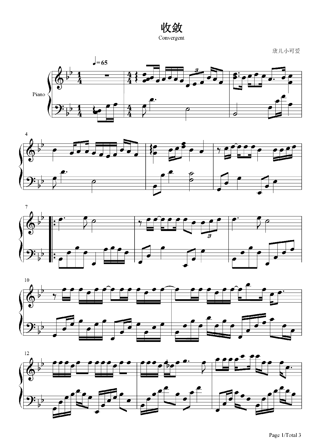 不够《收敛》钢琴谱,采用C调指法编配,共有3张高清图谱。...
