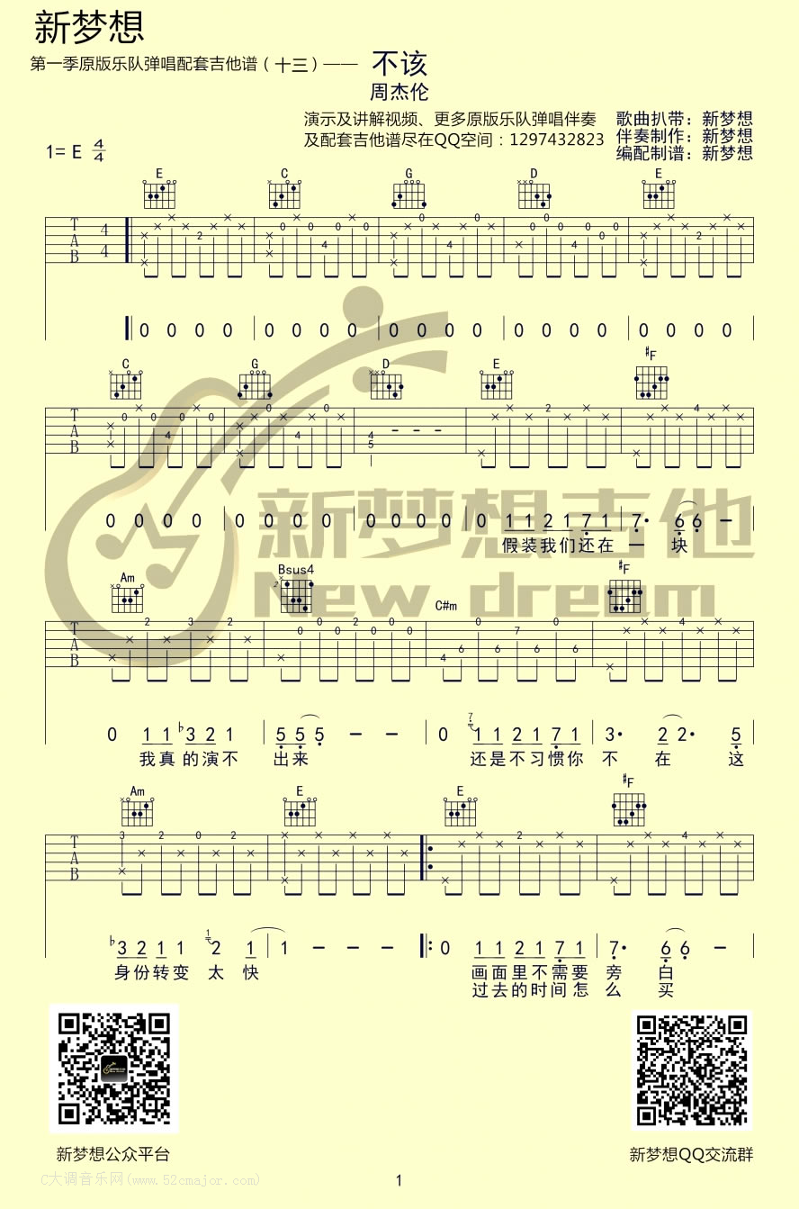周杰伦/张惠妹《不该》吉他谱,采用E调指法编配,共有3张高清图谱。...