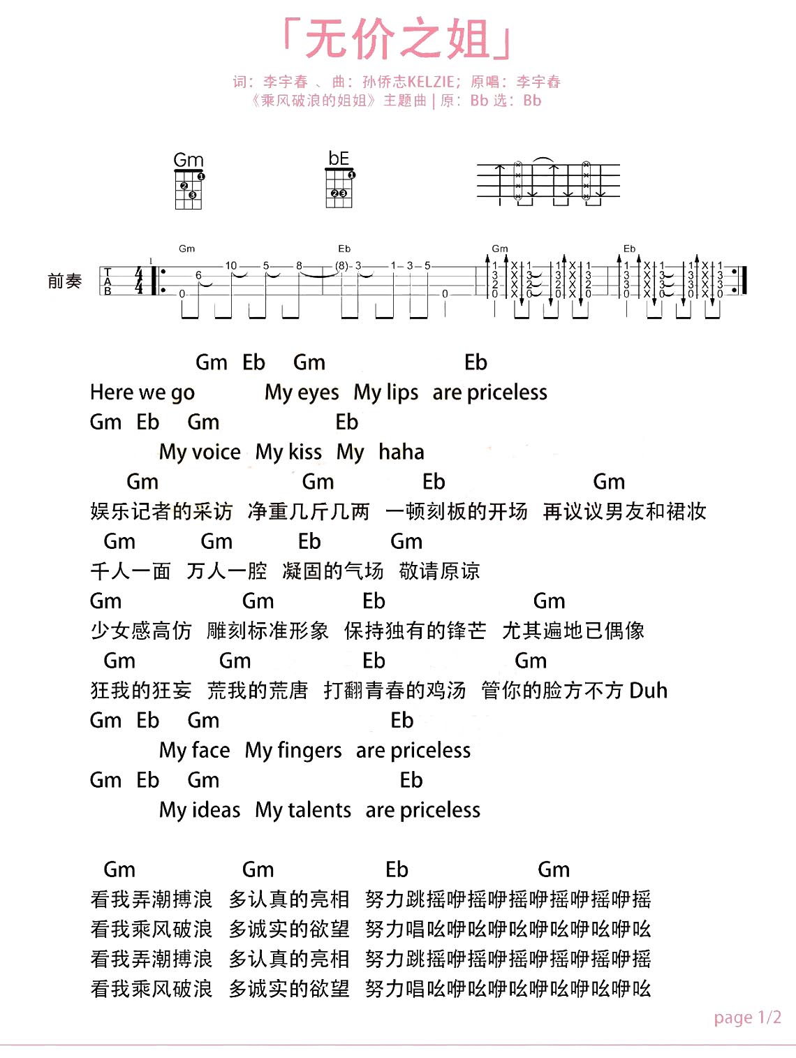 尤克里里《乘风破浪的姐姐》主题曲《无价之姐》尤克里里谱