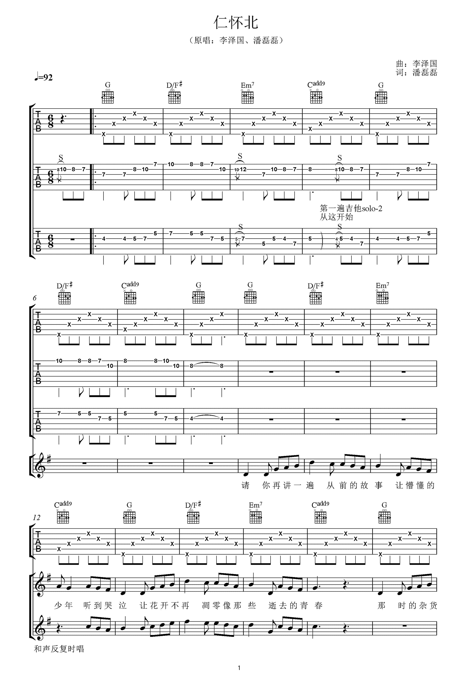 《仁怀北》吉他谱_李泽国/潘磊磊_G调原版弹唱谱...