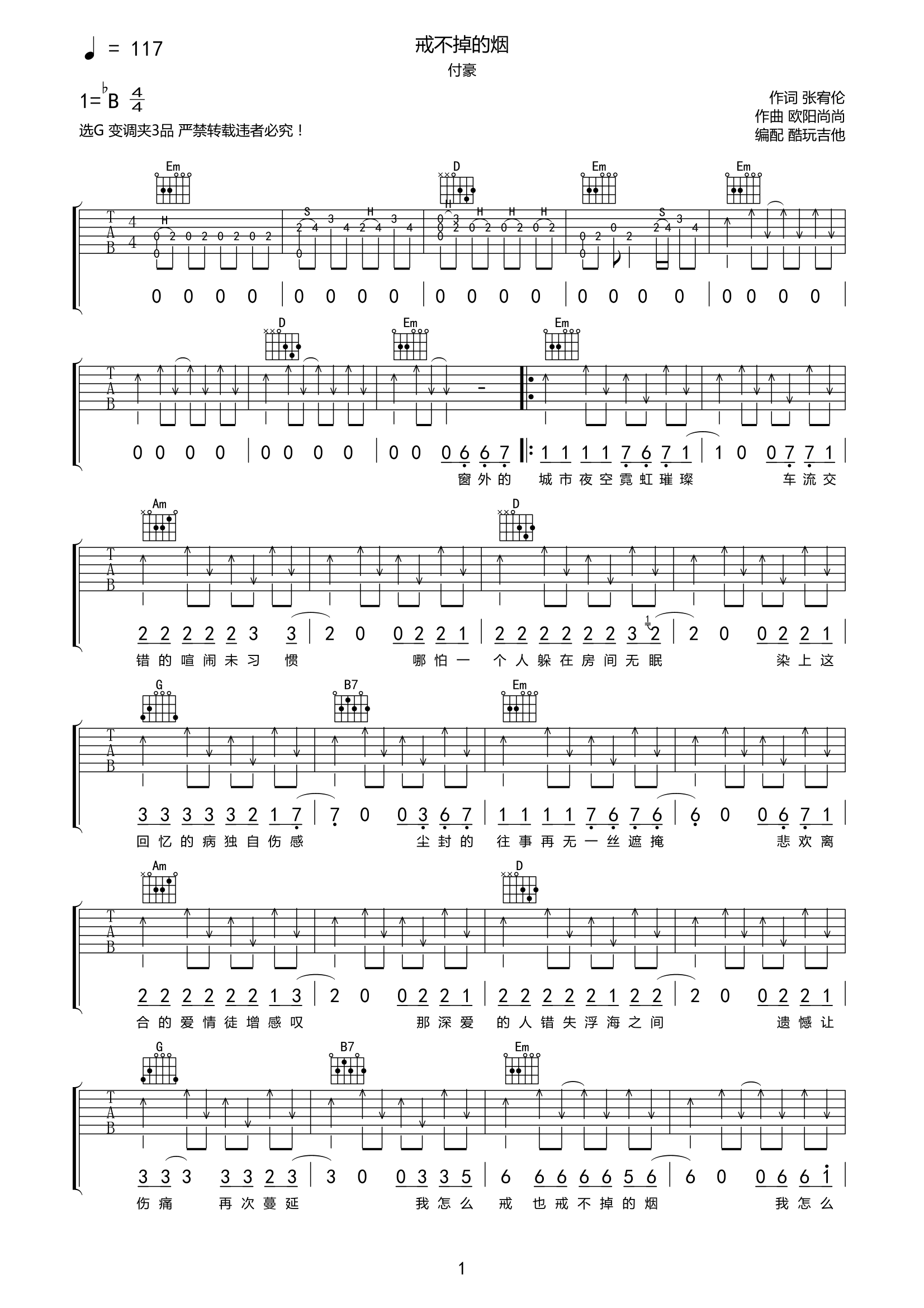 吉他付豪《解不掉的烟》吉他谱-G调高清六线谱