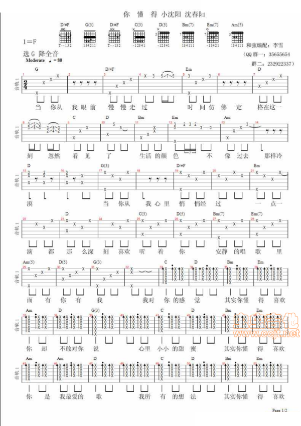 你懂得吉他谱-小沈阳/沈春阳-吉他谱弹唱谱电视剧后厨插曲变调夹5品两页免翻页音频为手机录制只是录制了前奏部分谱中用到拍弦和扫切技巧相对简单...