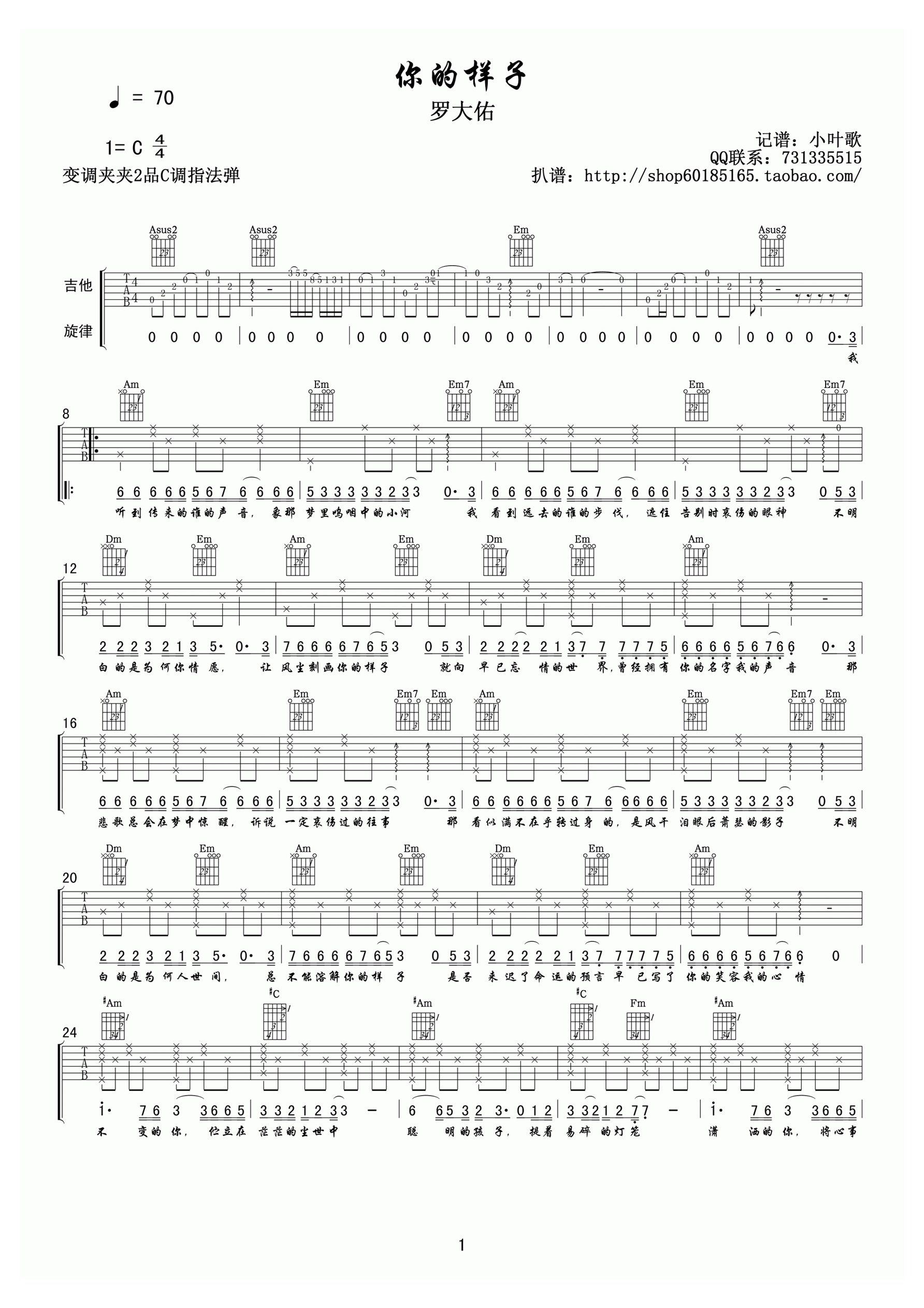 吉他罗大佑《你的样子》吉他谱_吉他弹唱谱_小叶歌编配