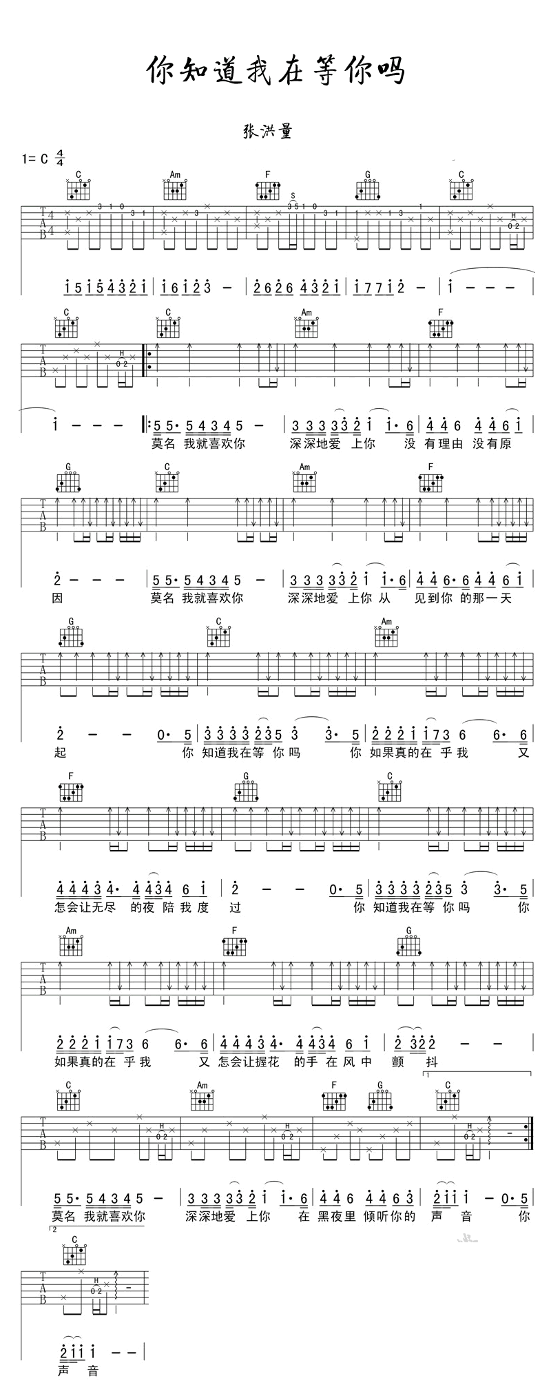 吉他你知道我在等你吗吉他谱_C调_张洪量_弹唱谱