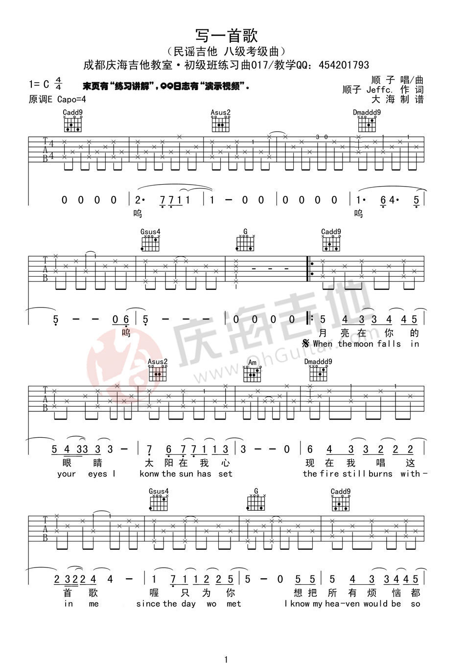 吉他顺子《写一首歌》吉他谱_吉他弹唱谱
