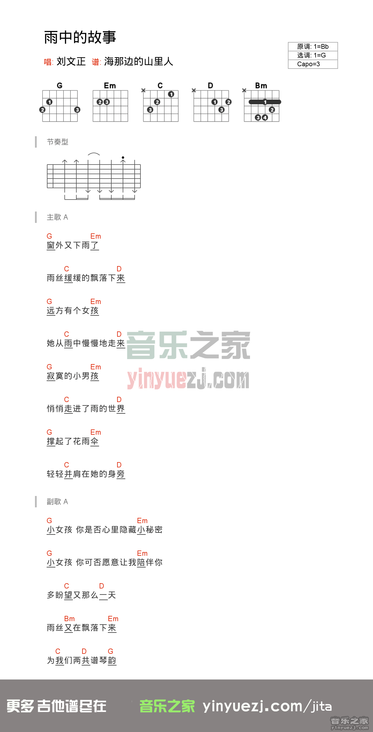 刘文正《雨中的故事》吉他谱,YYZJ编配出品,共有1张高清图谱,免翻页排版设计。...