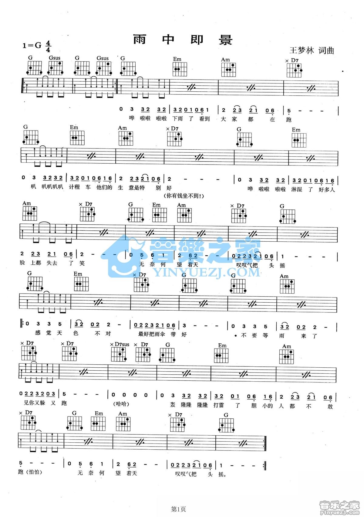 G调版刘文正《雨中即景》吉他弹唱六线谱...