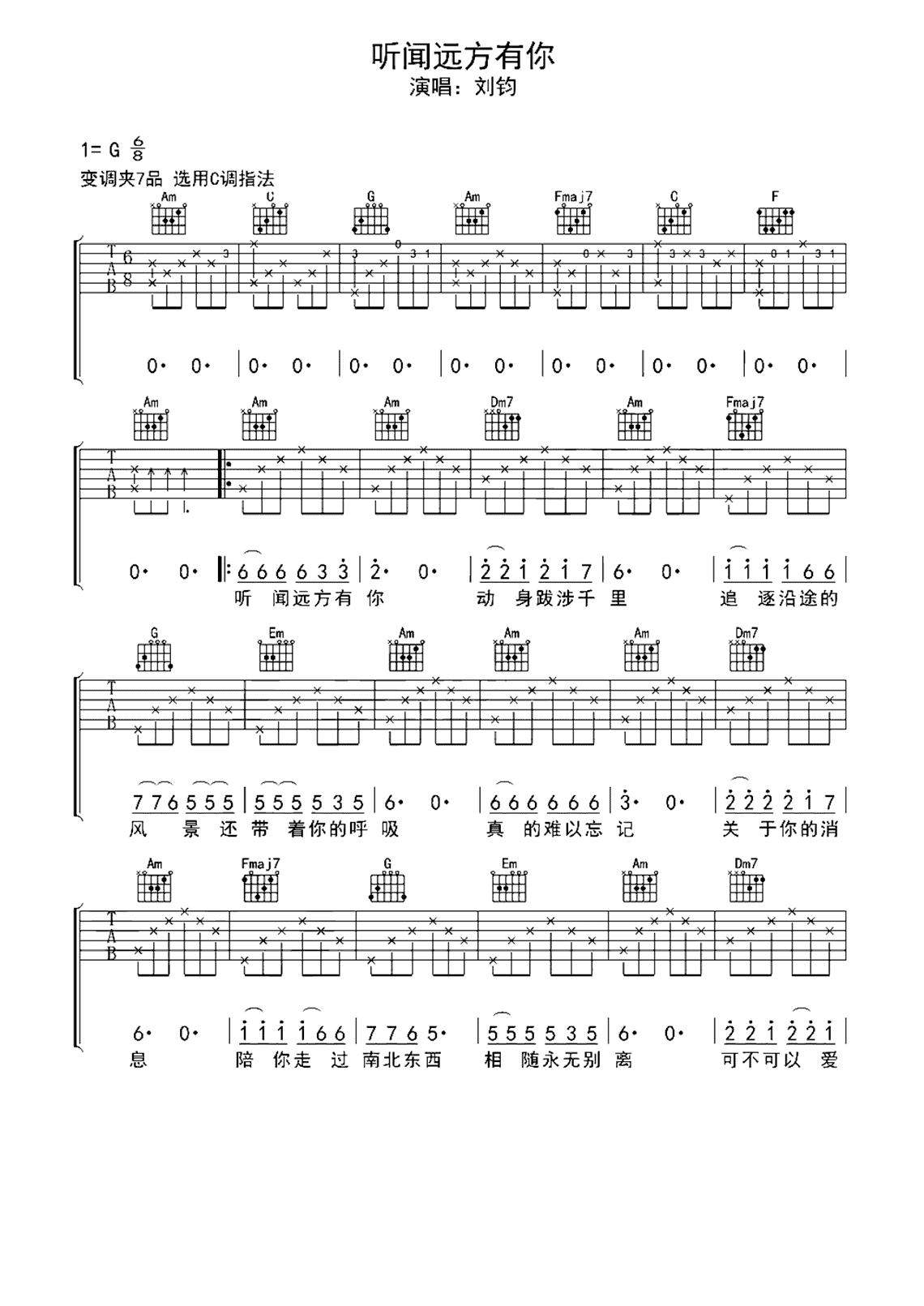 刘钧《听闻远方有你》吉他谱-C调弹唱谱高清六线谱...