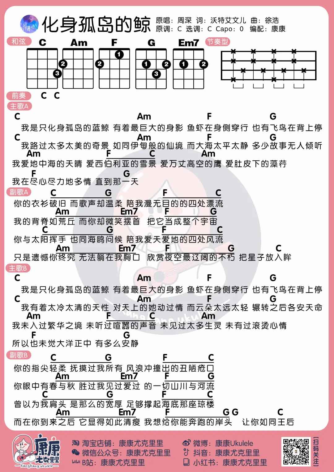 尤克里里谢安琪《化身孤岛的鲸》尤克里里曲谱-C调弹唱谱