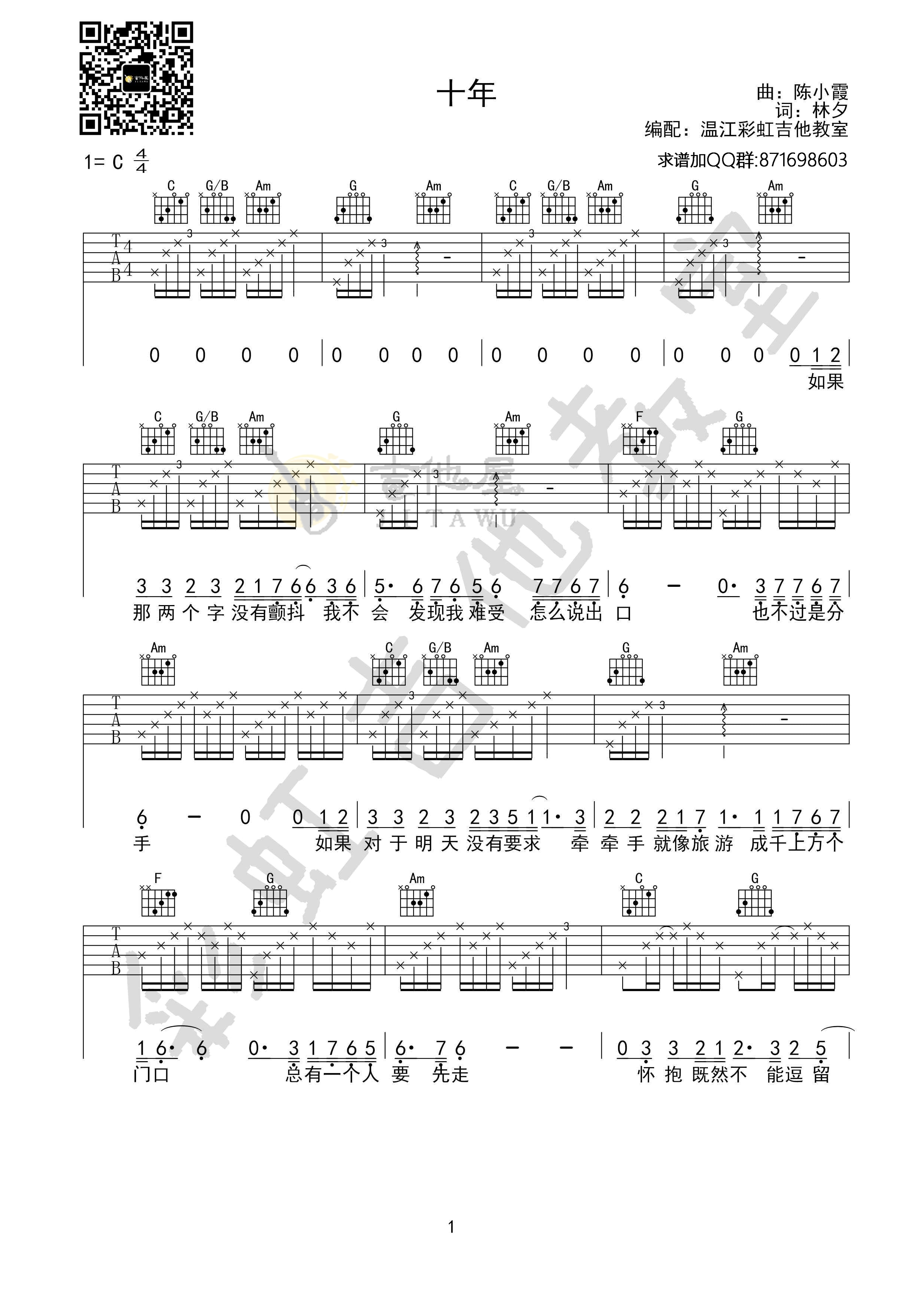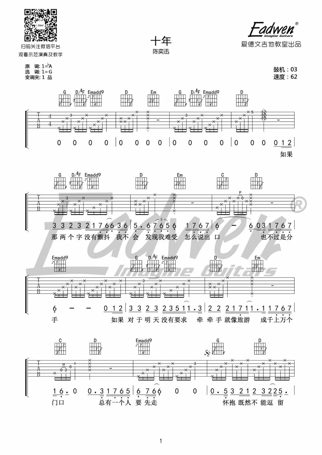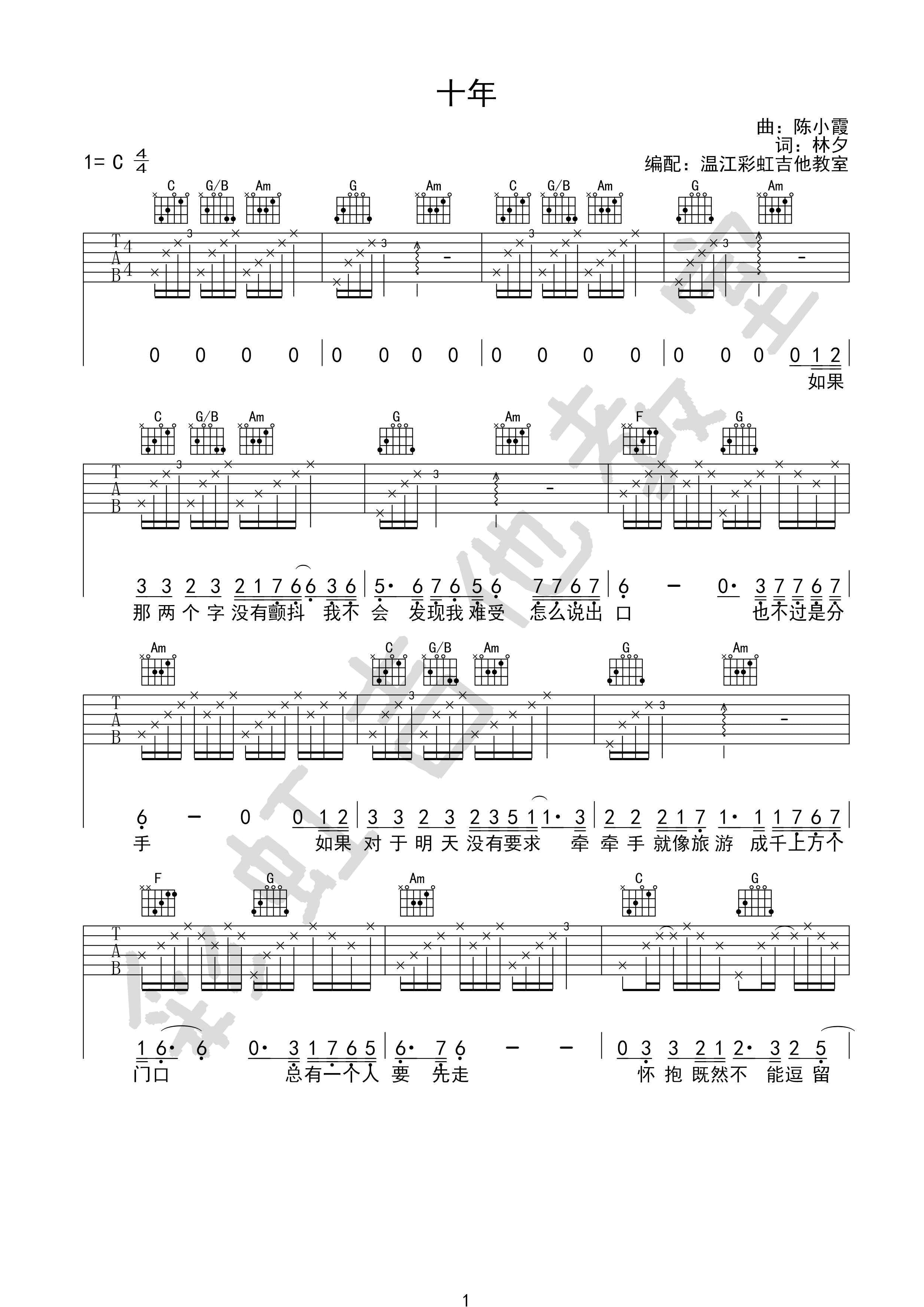 陈奕迅《十年》吉他谱,爱德文吉他教室编配出品,共有3张高清图谱。...