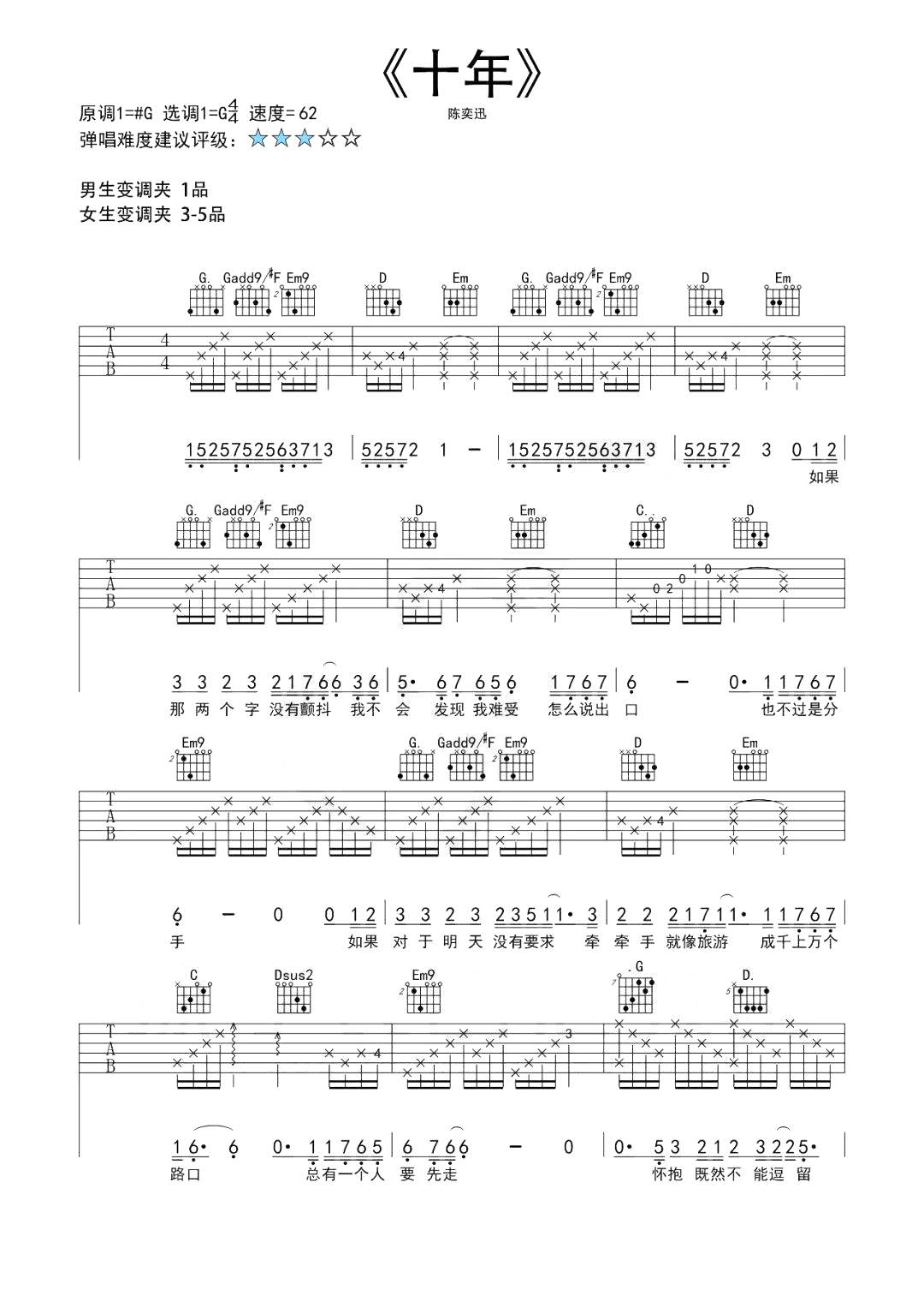 陈奕迅《十年》吉他谱G调原版六线谱...