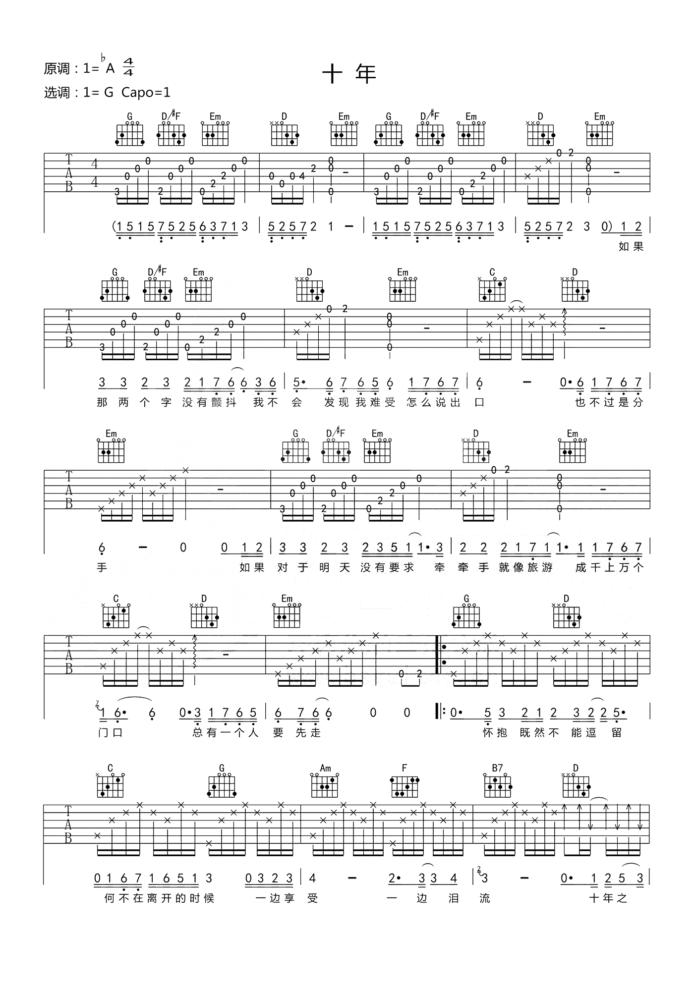 吉他陈奕迅《十年》吉他谱 G调原版六线谱