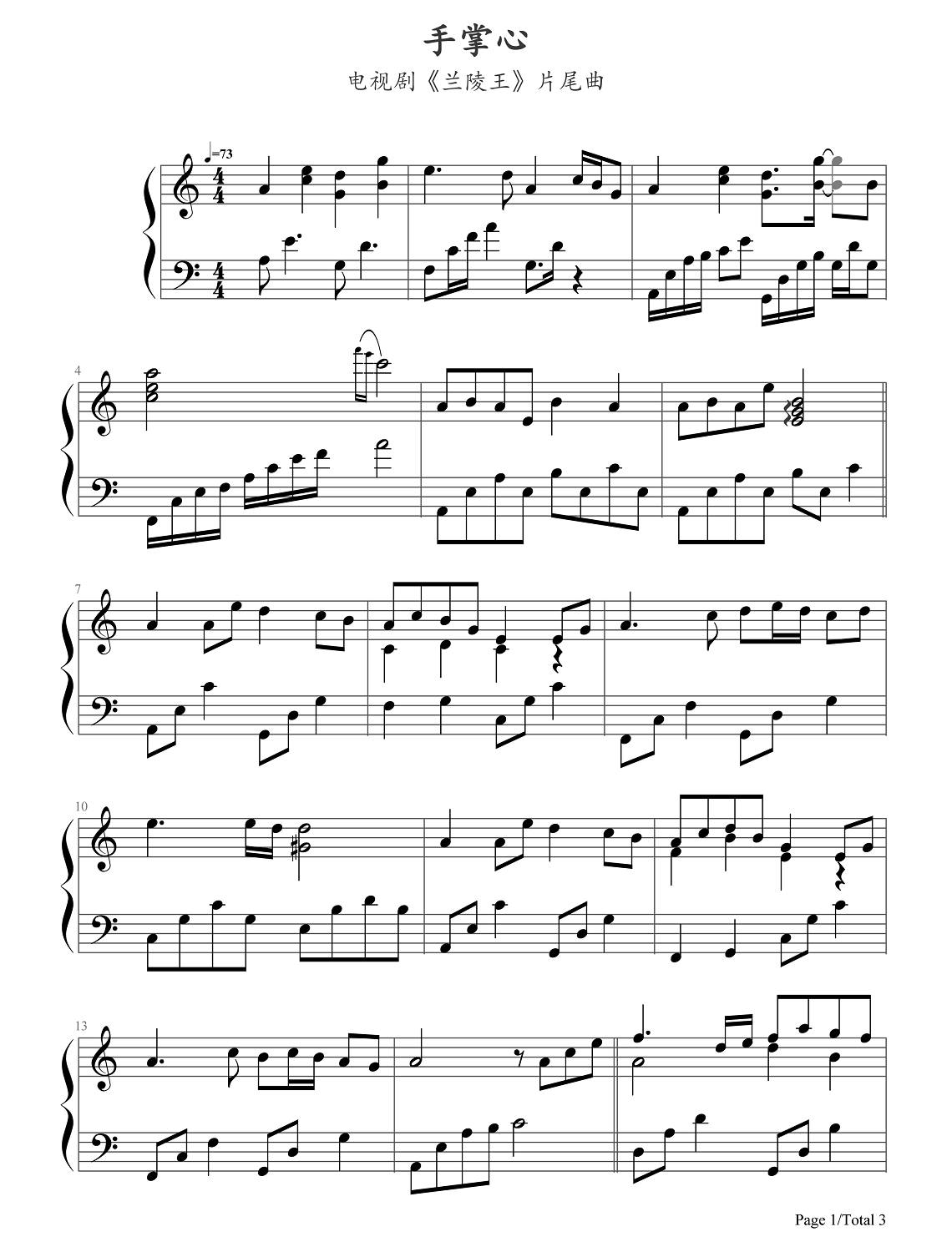 钢琴《兰陵王》片尾曲《手掌心》钢琴谱
