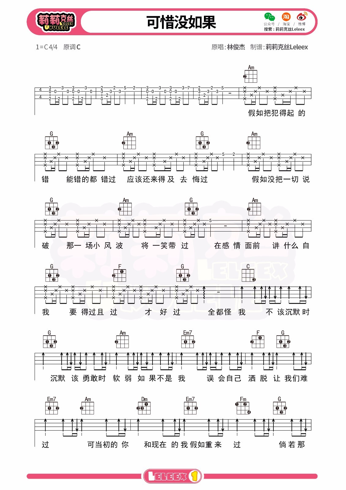 尤克里里林俊杰《可惜没如果》尤克里里曲谱-C调弹唱谱