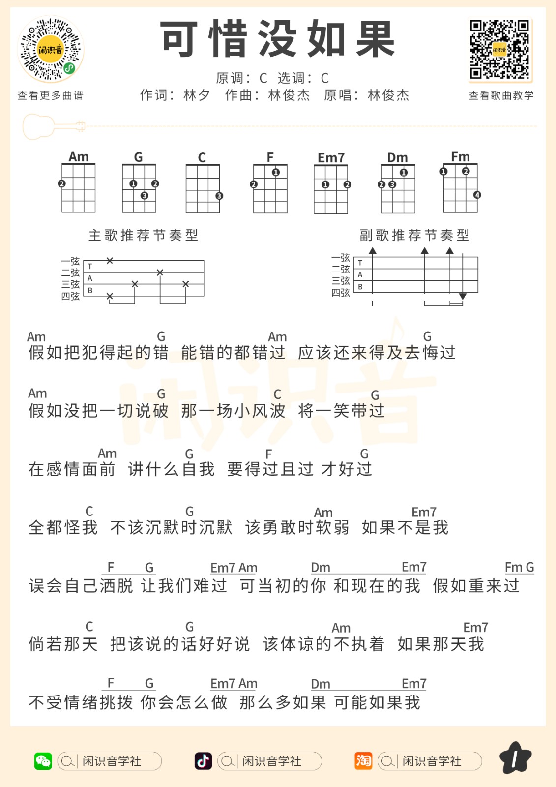 林俊杰《可惜没如果》尤克里里谱C调扫弦版...