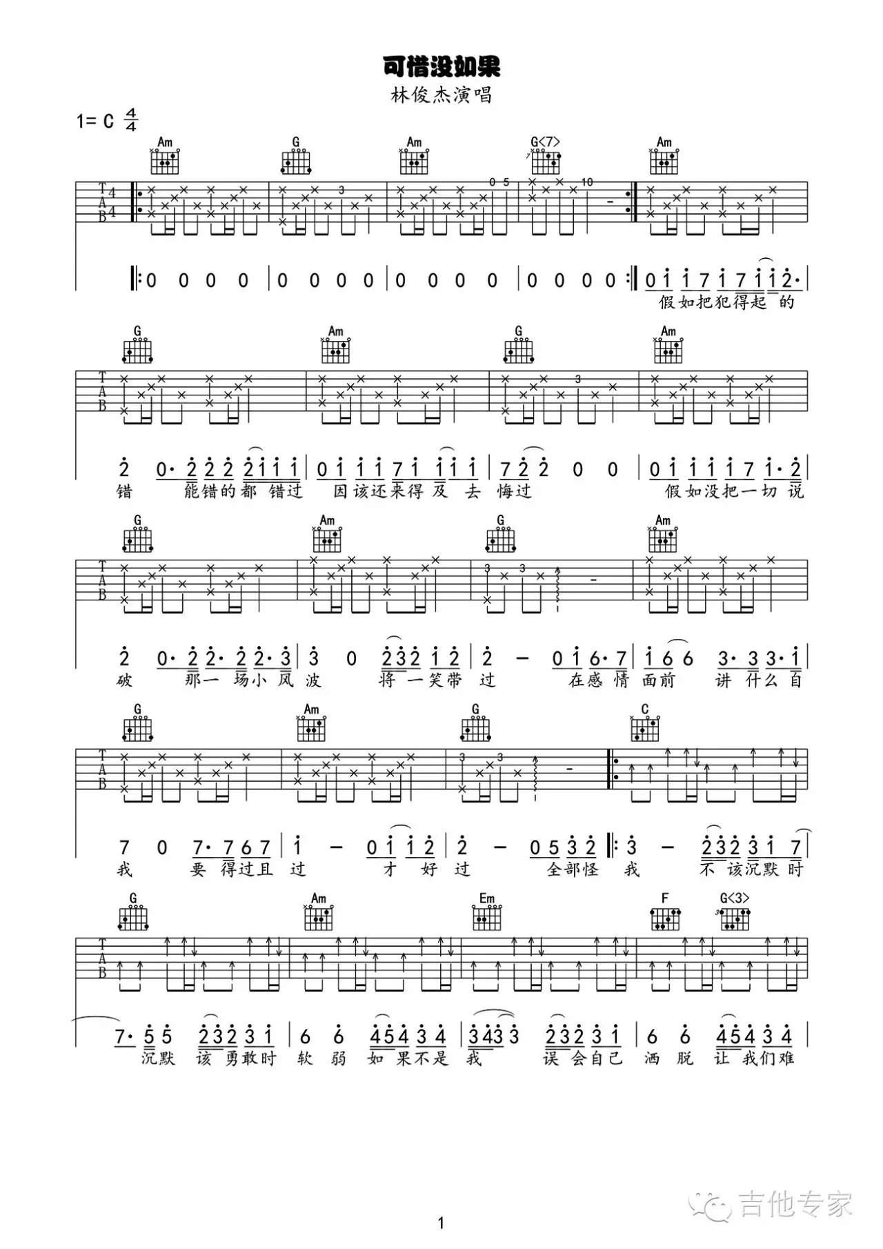 吉他可惜没如果吉他谱_C调_林俊杰_弹唱谱_高清六线谱