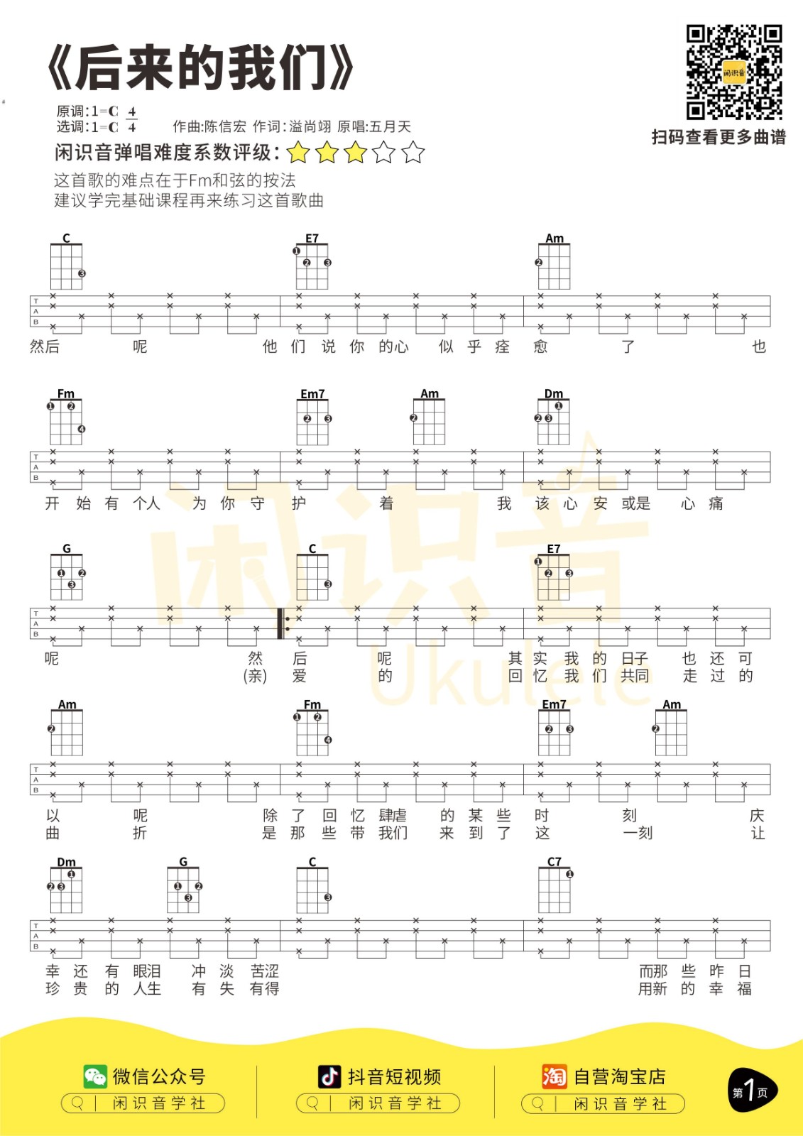 五月天《后来的我们》尤克里里曲谱-C调弹唱谱...