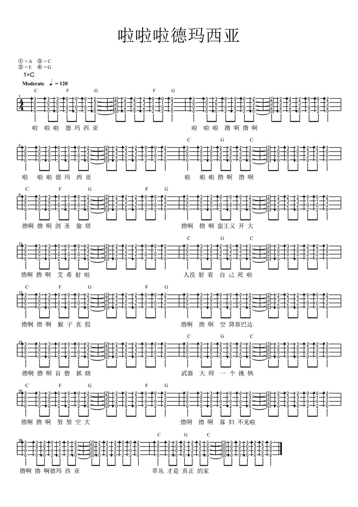 音频怪物《啦啦啦德玛西亚》尤克里里谱指弹版A调六线谱_音频怪物...