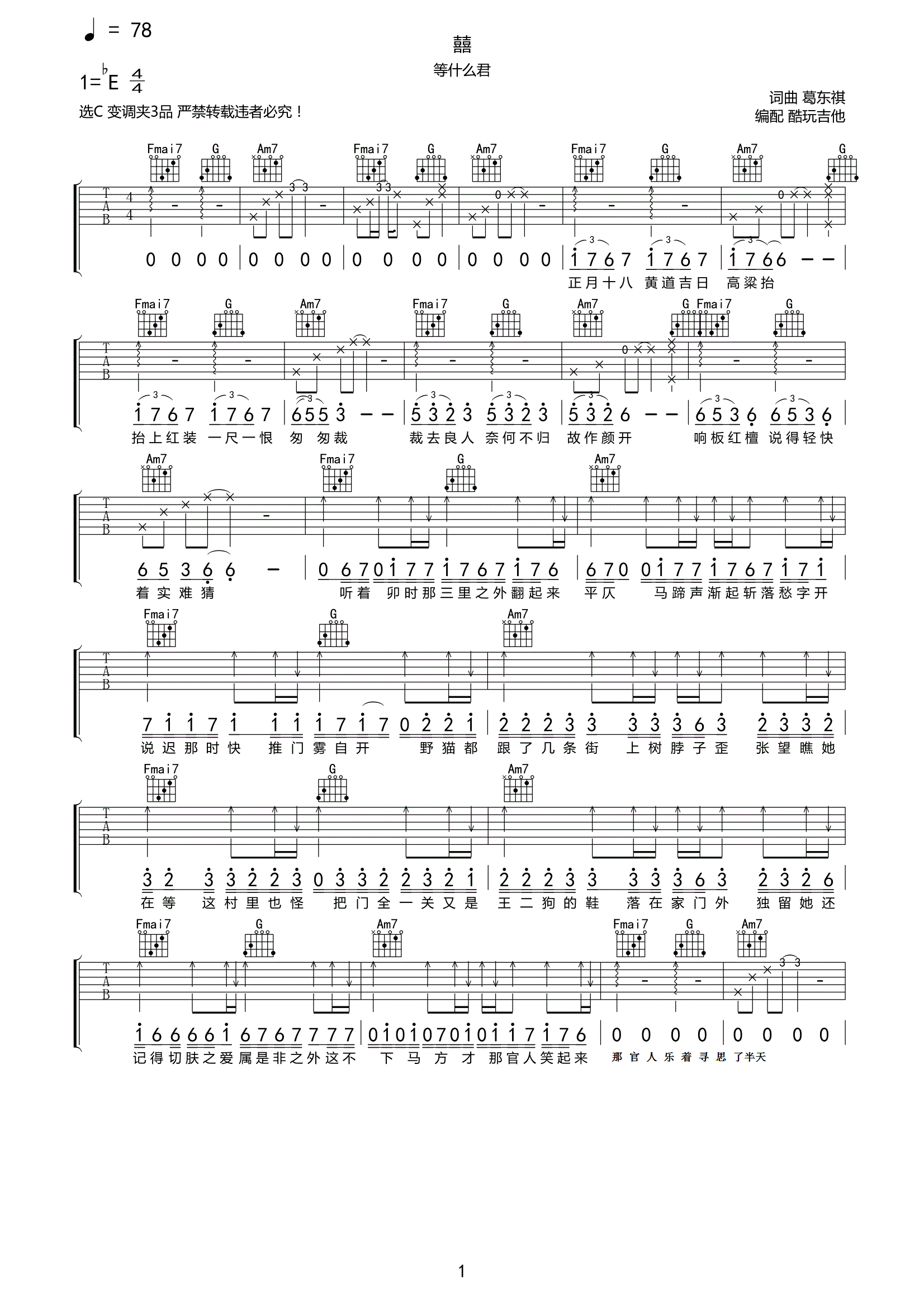 等什么君《囍》吉他谱-C调六线谱弹唱谱...