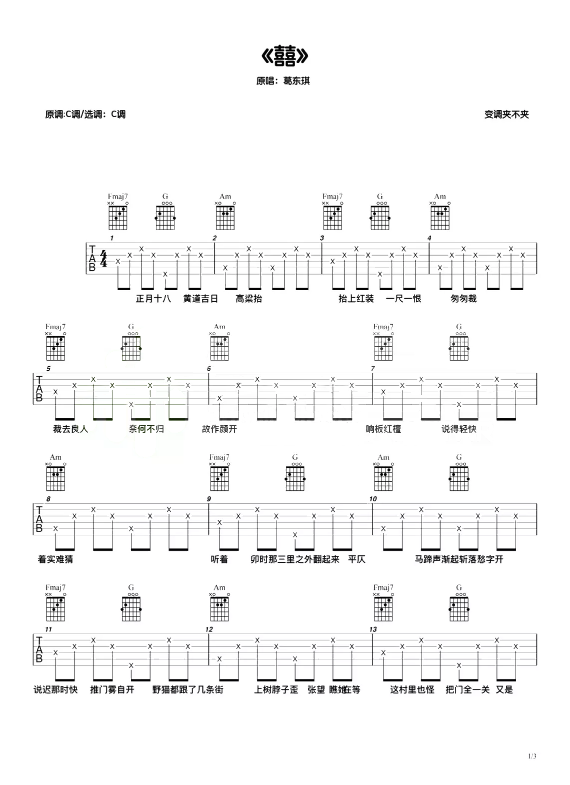 吉他葛东琪《囍》吉他谱-弦木吉他-C调弹唱谱