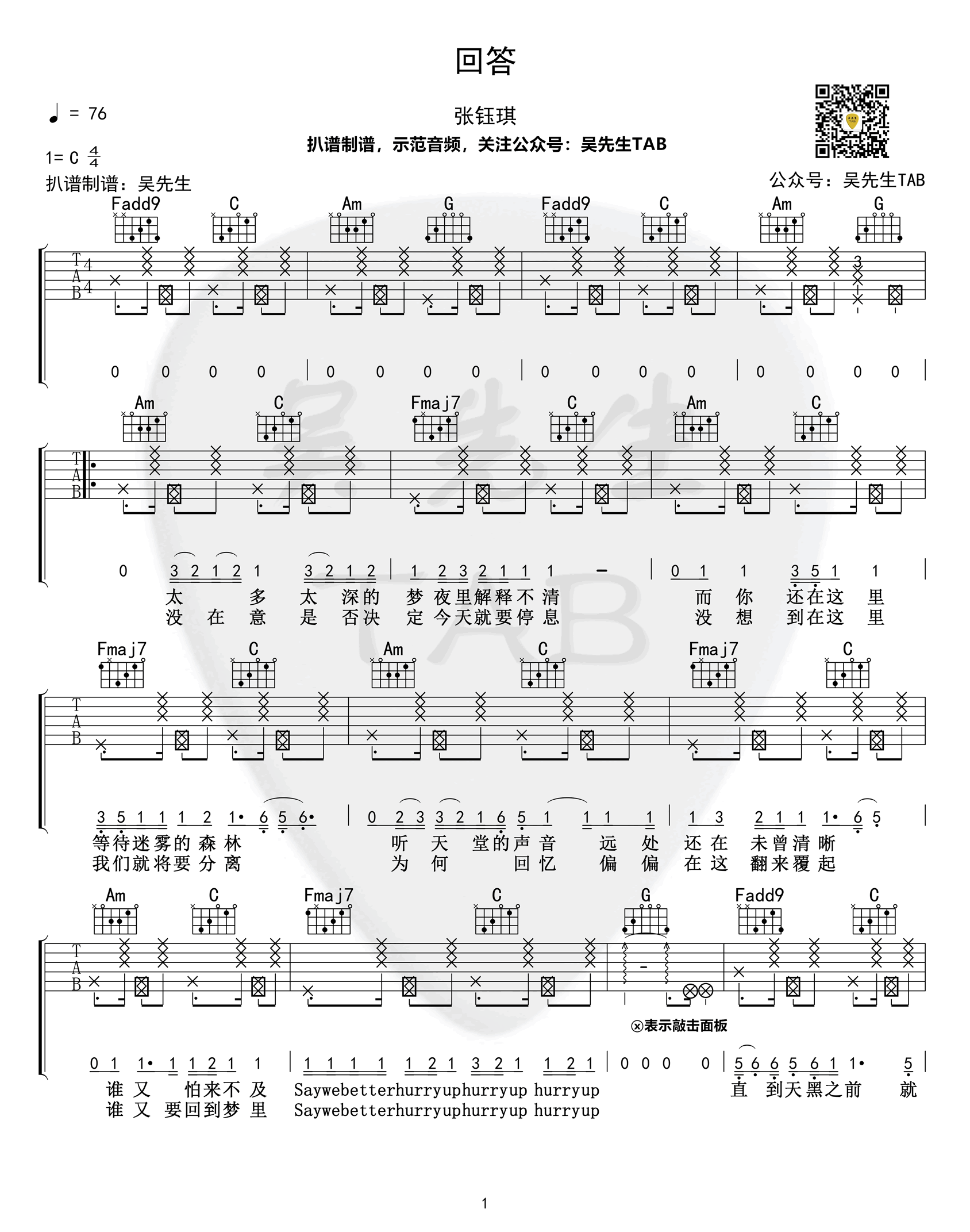 回答吉他谱C调高清版__张钰琪_...