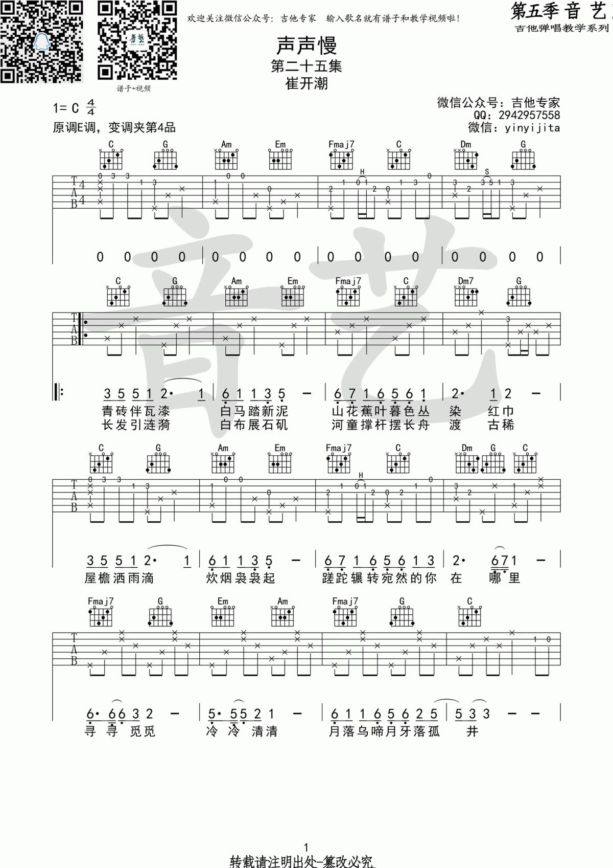 声声慢吉他谱,崔开潮演唱,一首经典民谣歌曲。时光轻拂,旧时的记忆无声流淌。思绪如烟,挥洒着对过往岁月的眷恋。《声声慢》吉他弹唱谱,原调E,采用C调指法,变调夹夹第四品,六线谱共两张图片,感谢革命吉他编配分享,酷玩吉他更新上传。歌声徐徐引领,穿梭在青砖瓦漆之间。沁入白马新泥,融入蕉...