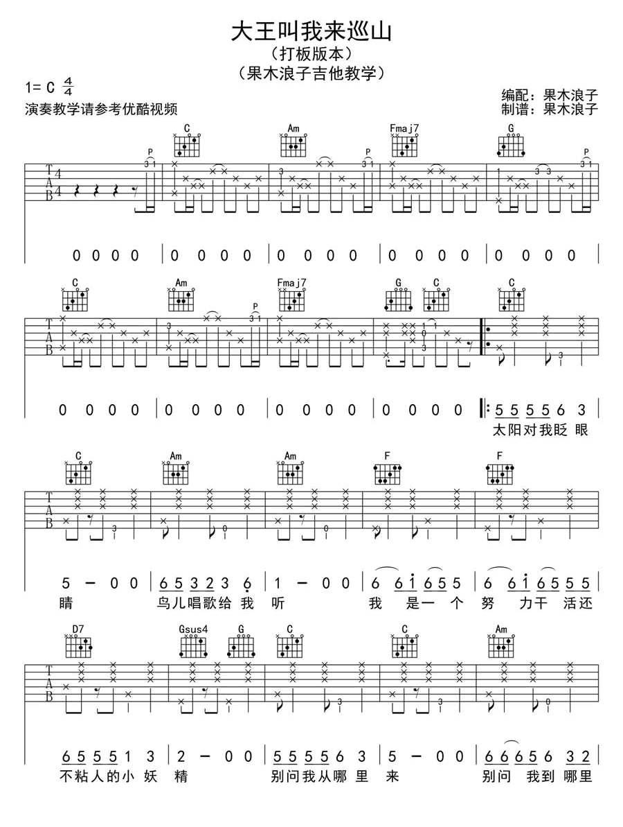 大王叫我来巡山吉他谱_C调打板_赵英俊《大王叫我来巡山》吉他弹唱,感谢果木浪子编配分享。吉他谱采用C调和弦指法编配,三张图片六线谱。...