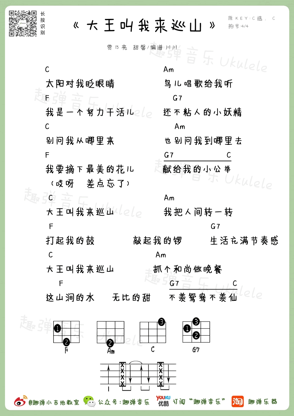 尤克里里贾乃亮甜馨《大王叫我来巡山》尤克里里谱