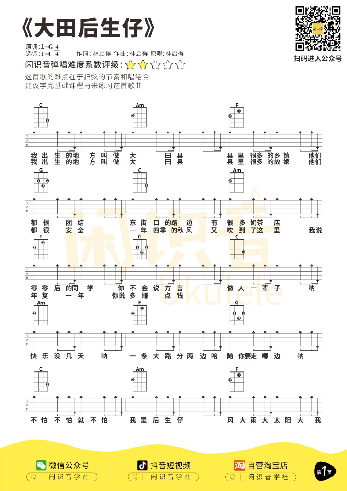 林启得《大田后生仔》尤克里里曲谱-C调弹唱谱...