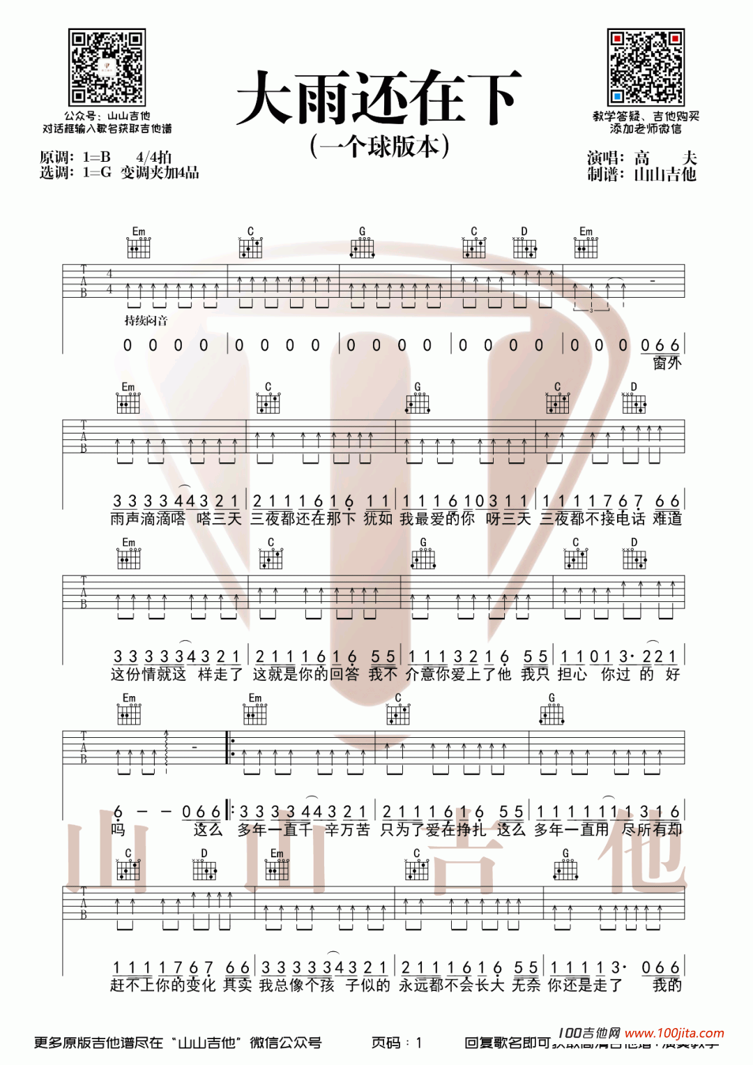 吉他一个球《大雨还在下》吉他谱_吉他弹唱谱_山山吉他编配