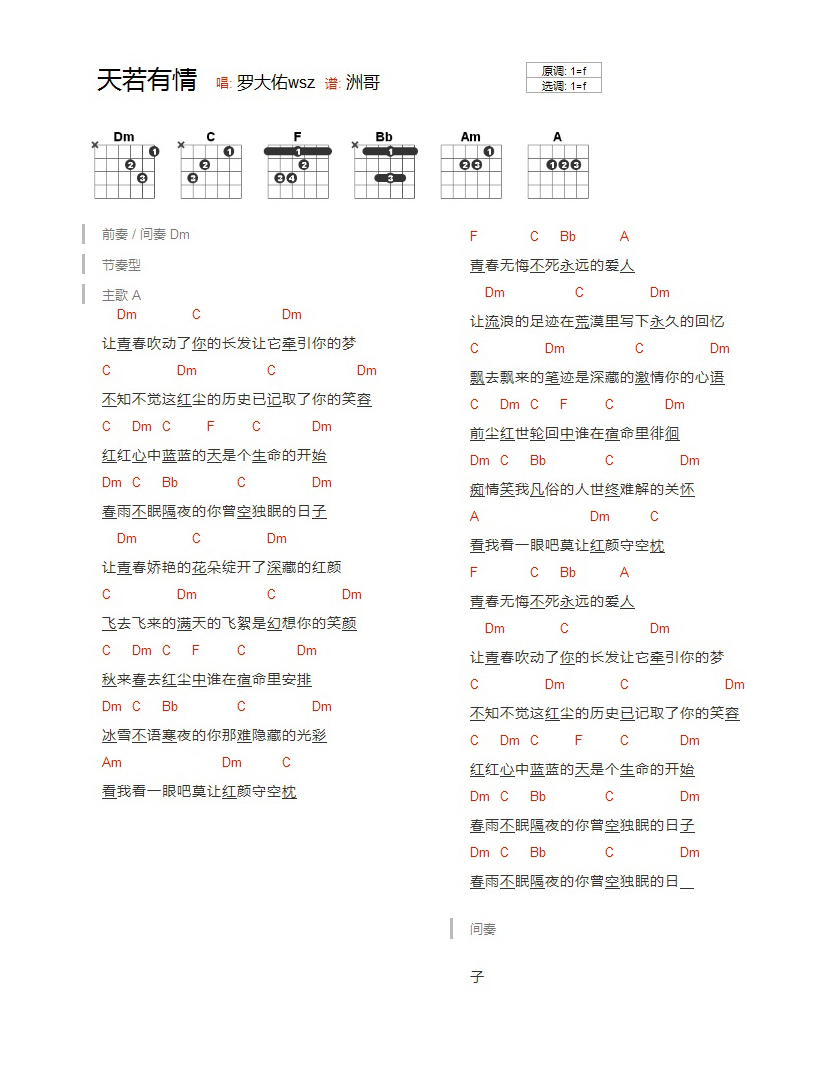 吉他罗大佑《天若有情》吉他谱_吉他弹唱谱_YYZJ编配