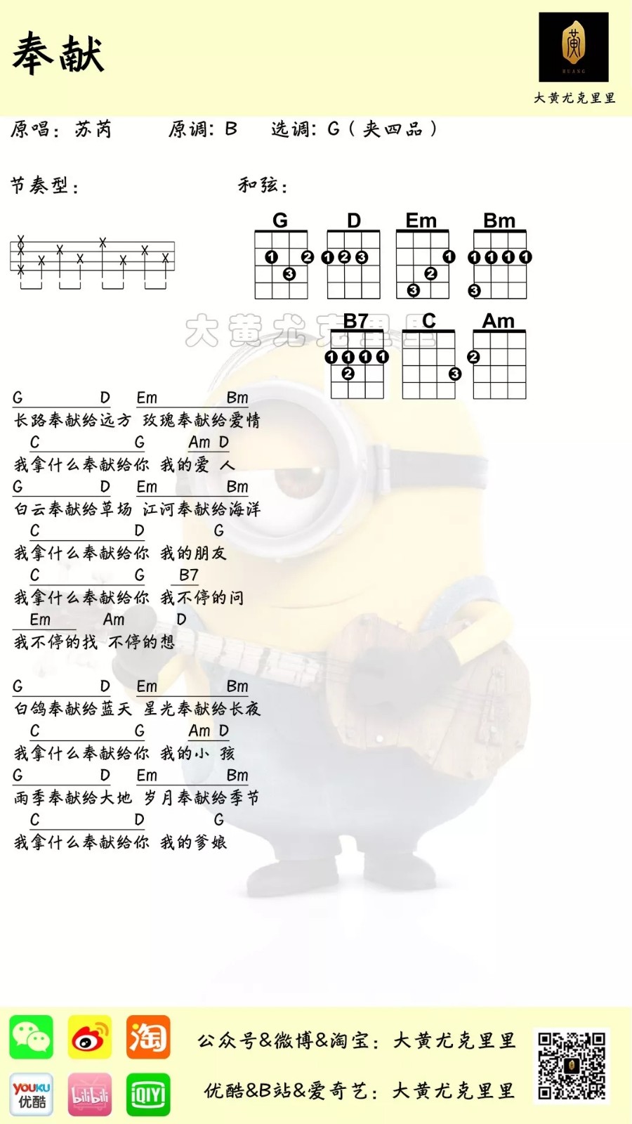 《奉献》尤克里里谱弹唱版G调和弦谱_大黄尤克里里编配_苏芮...
