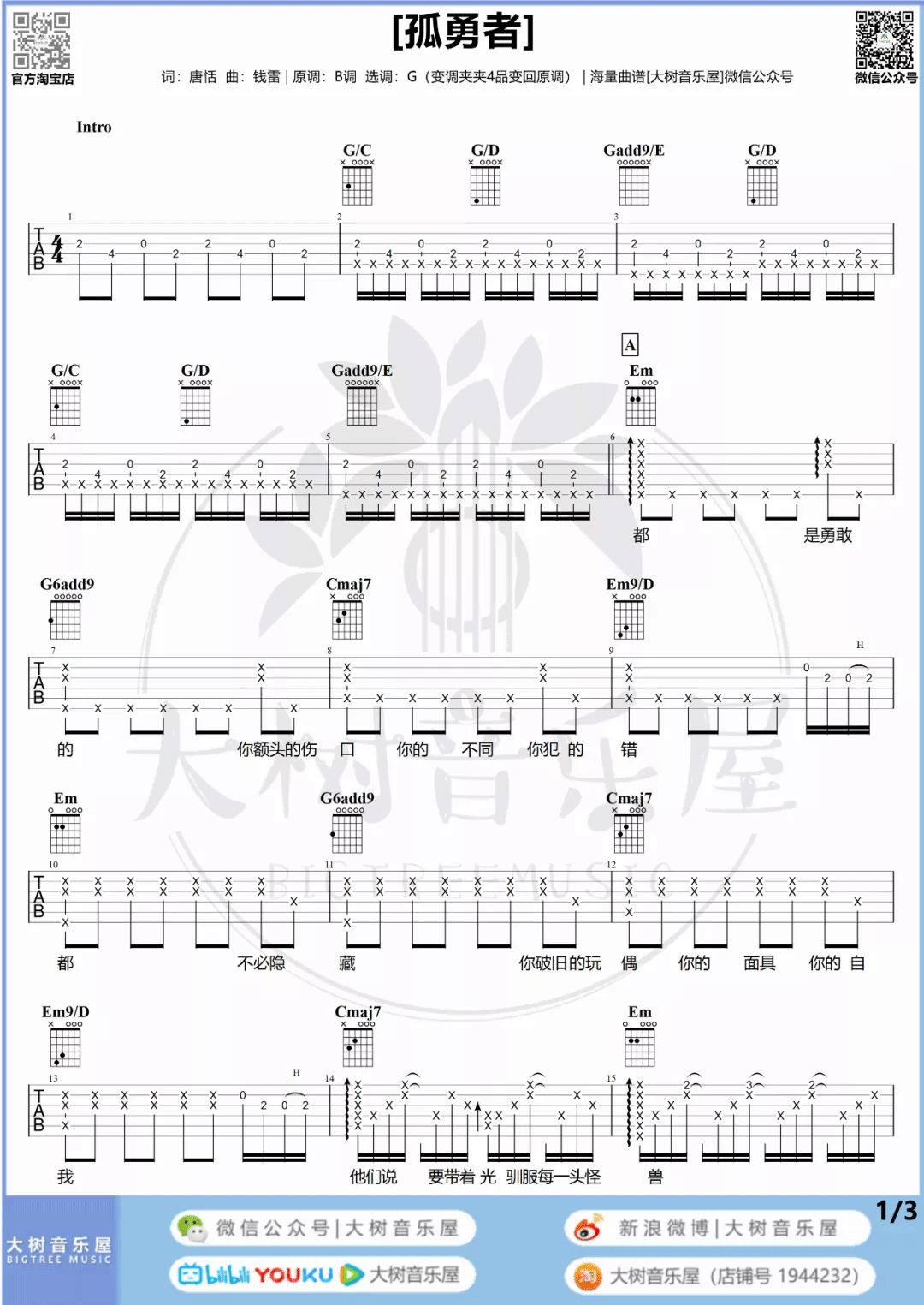 吉他孤勇者吉他谱_陈奕迅_《孤勇者》G调弹唱谱_高清六线谱