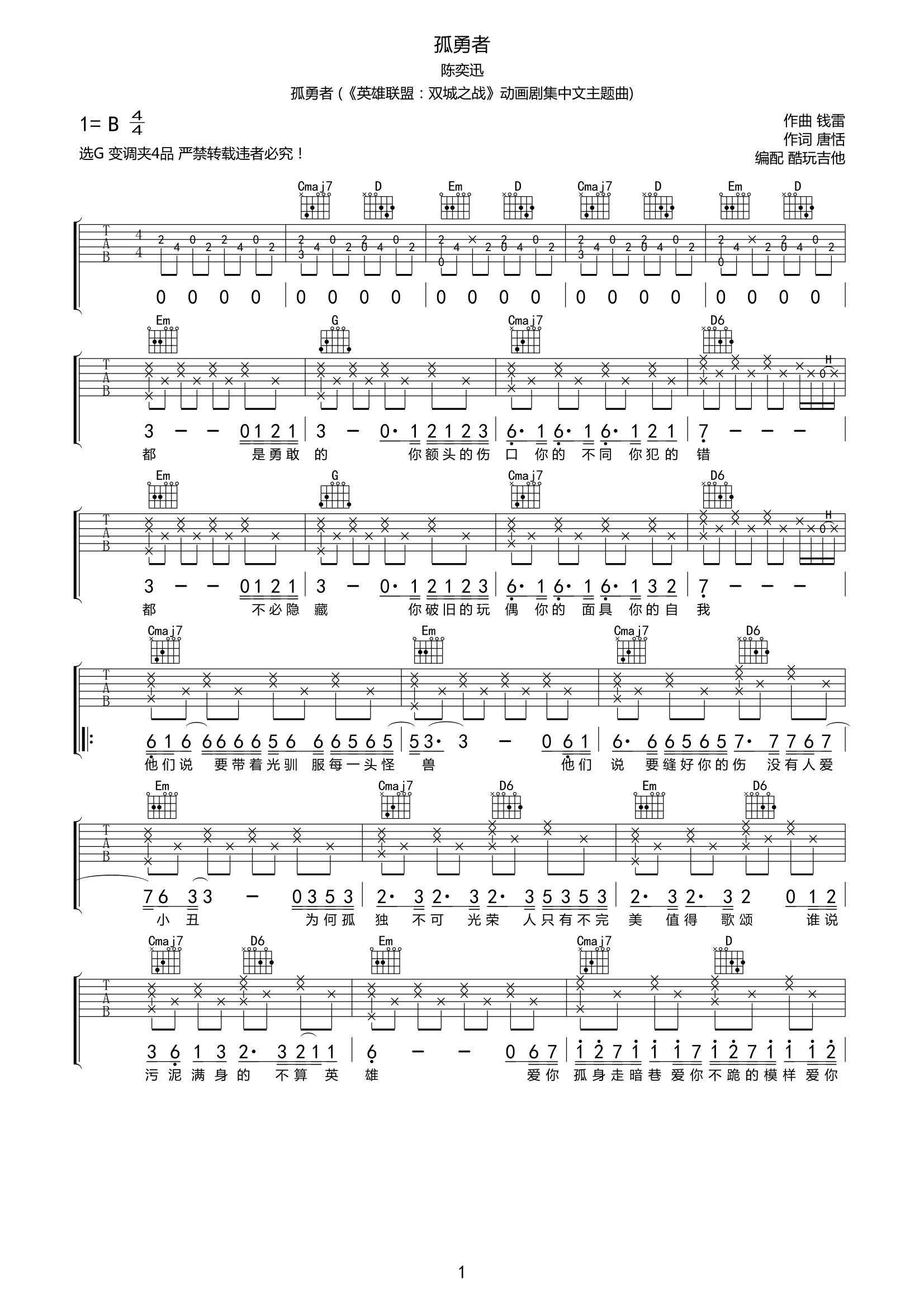 吉他《孤勇者》吉他谱_陈奕迅_G调原版六线谱
