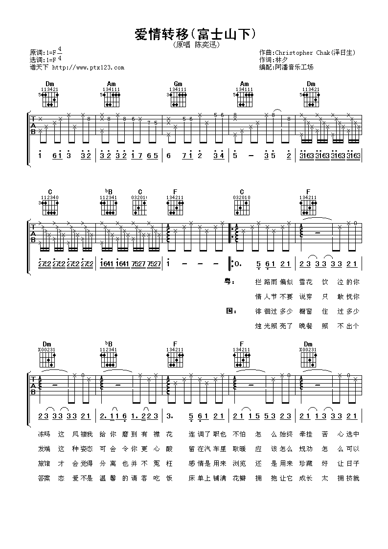 陈奕迅《富士山下》吉他谱F调附前奏...