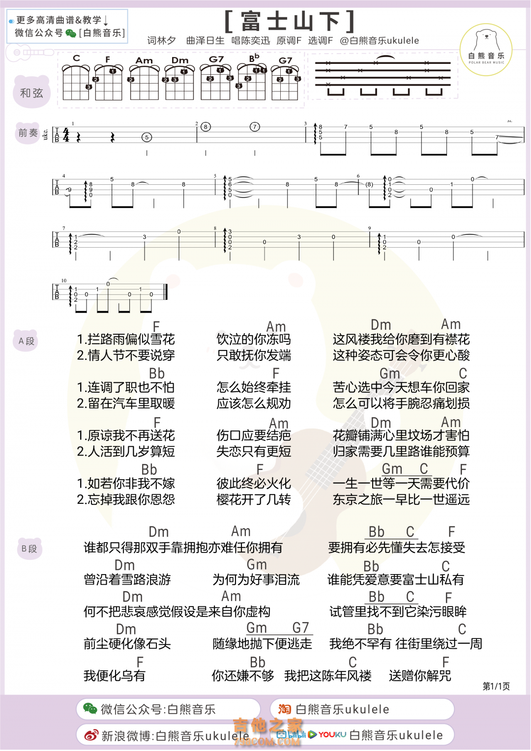 陈奕迅《富士山下》尤克里里弹唱谱白熊音乐...