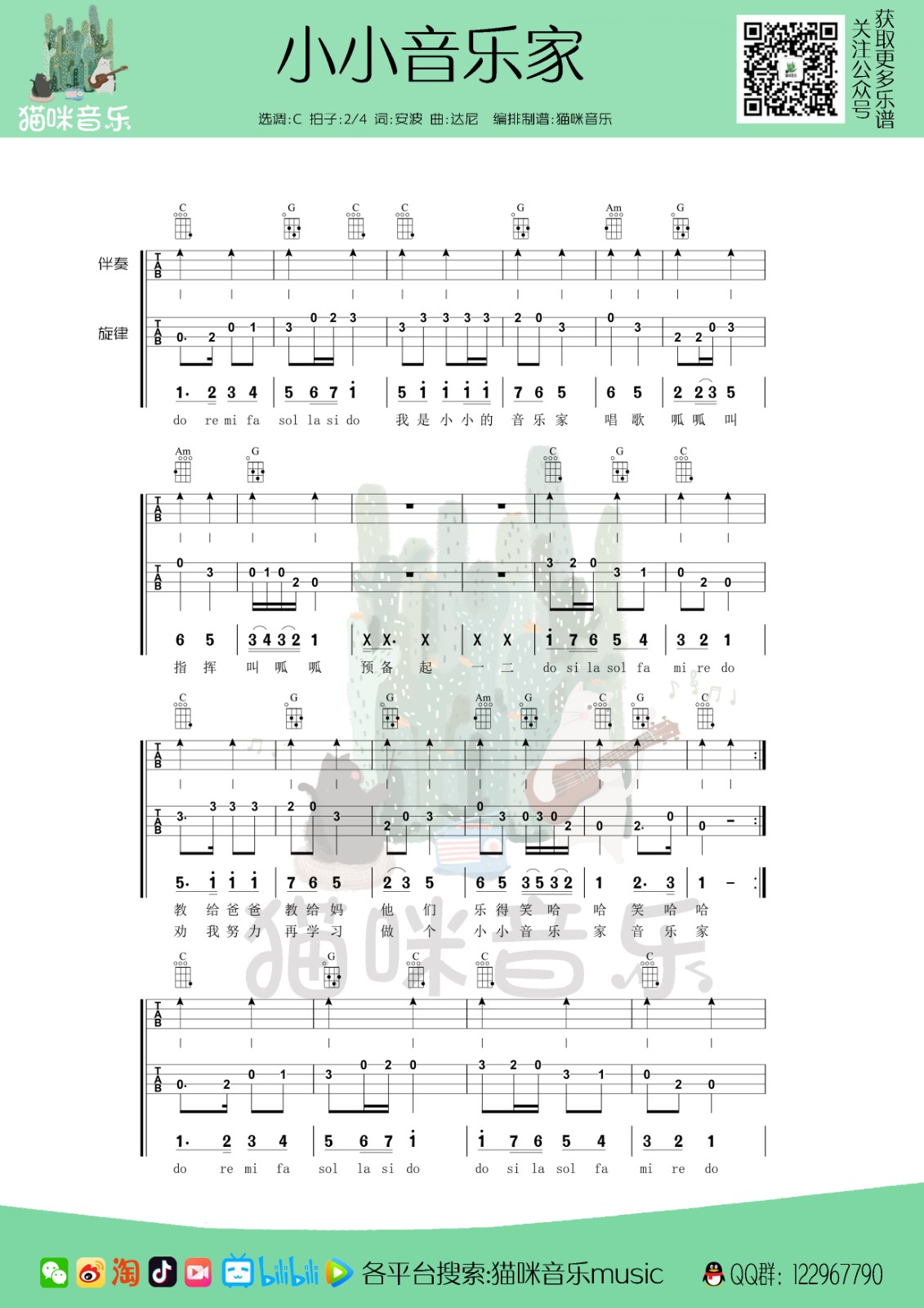 儿歌《小小音乐家》尤克里里谱-C调完整弹唱...