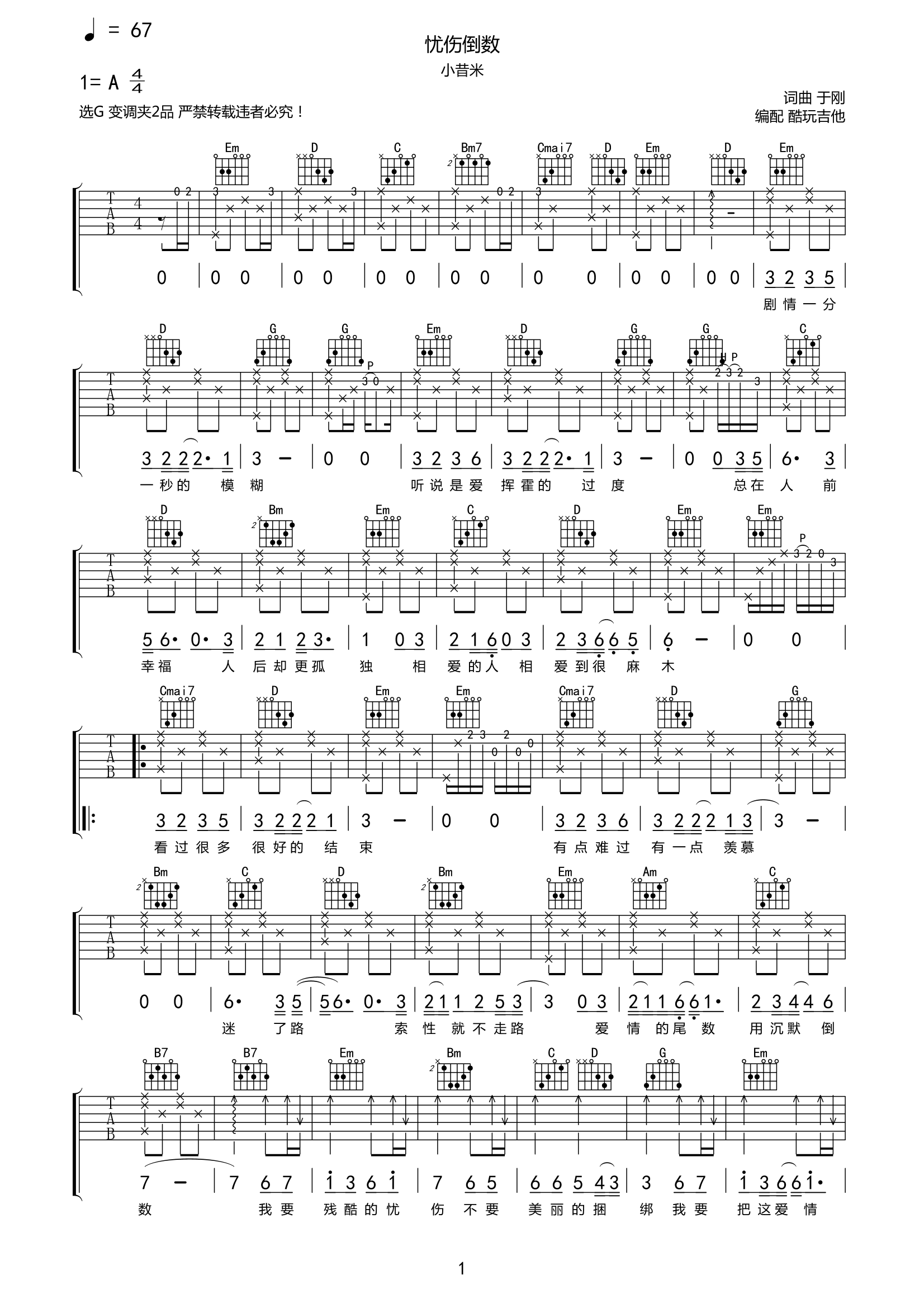 小昔米《忧伤倒数》吉他谱-G调六线谱弹唱谱...