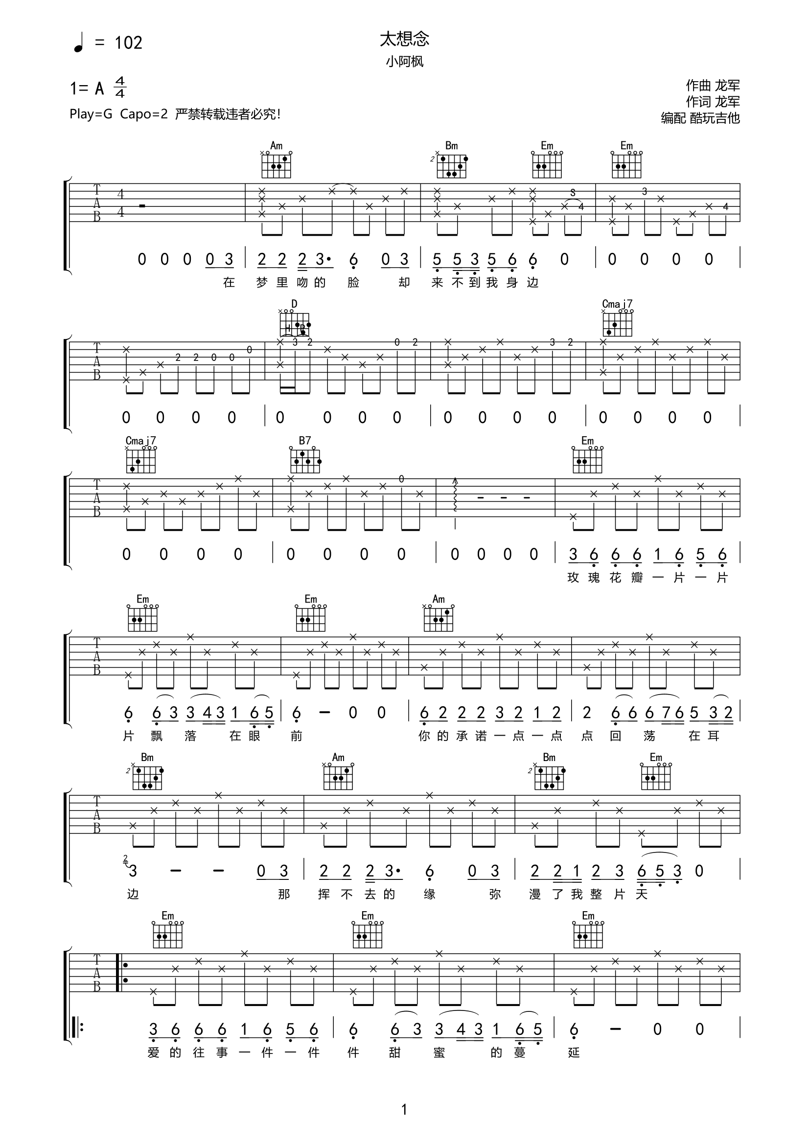 吉他小阿枫《太想念》吉他谱-G掉弹唱谱原版谱