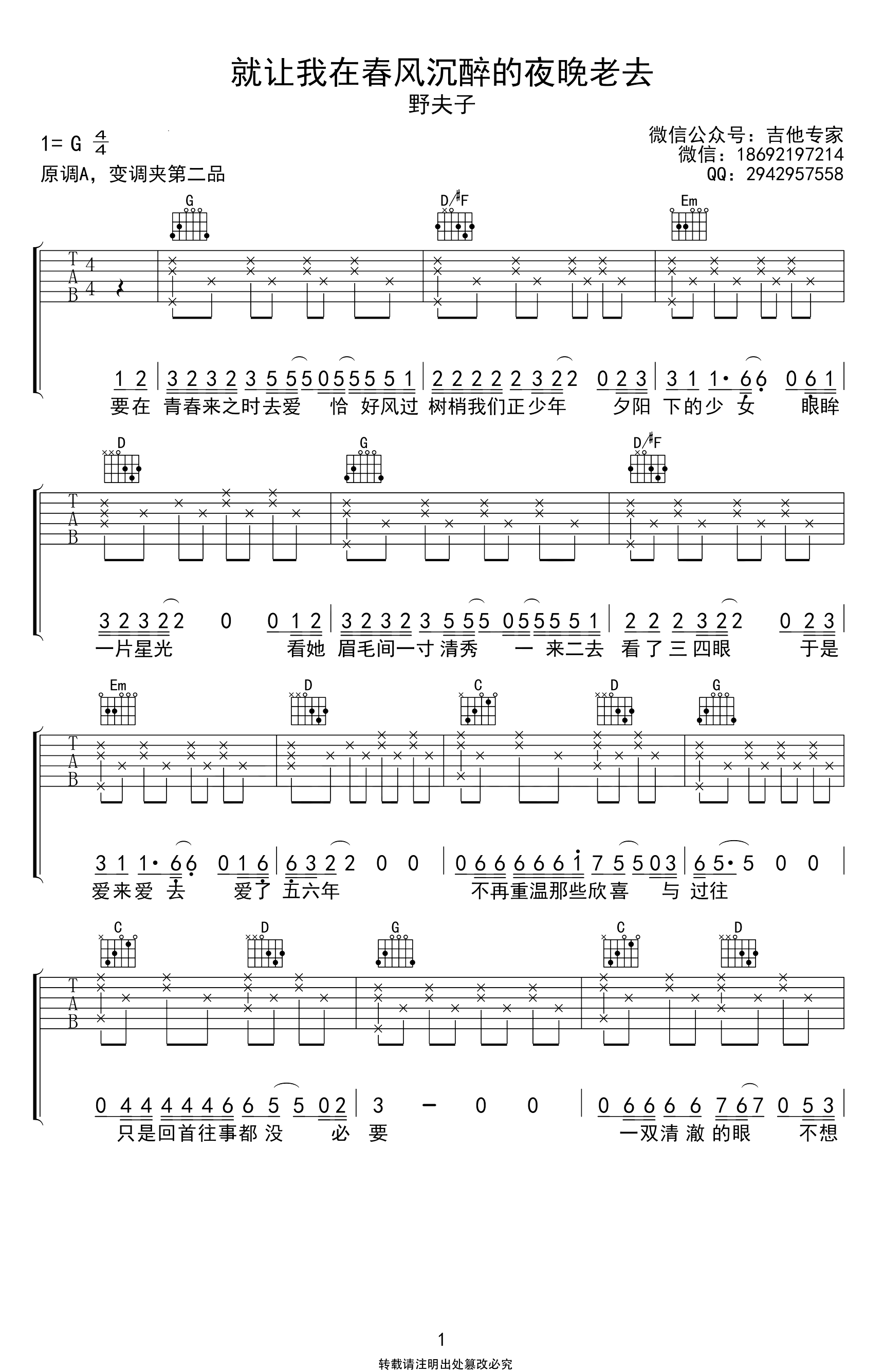 野夫子《就让我在春风沉醉的夜晚老去》吉他谱,采用G调指法编配,共有1张高清图谱,免翻页排版设计。...