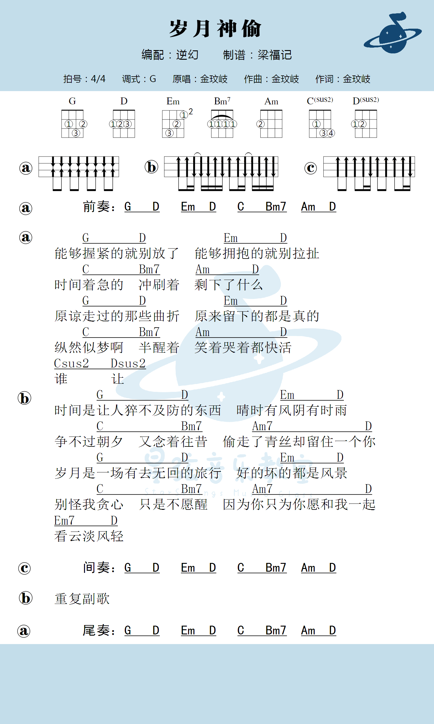 《岁月神偷》吉他谱,G调编配,金玟岐的一首代表作品,岁月神偷六线谱,完整版共四张高清图片谱,感谢梦马音乐编配出品...