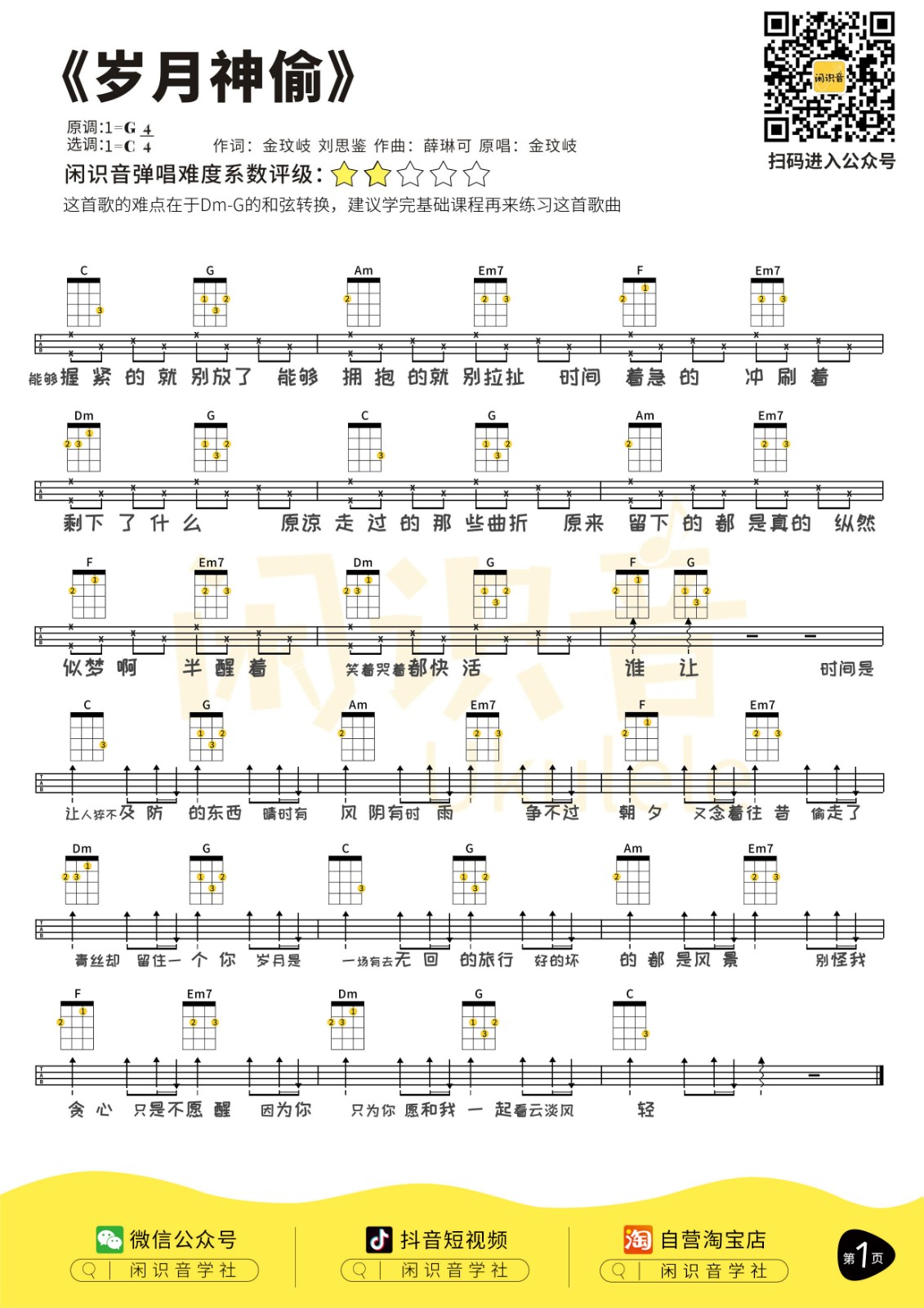 金玟岐《岁月神偷》尤克里里曲谱-C调弹唱谱...