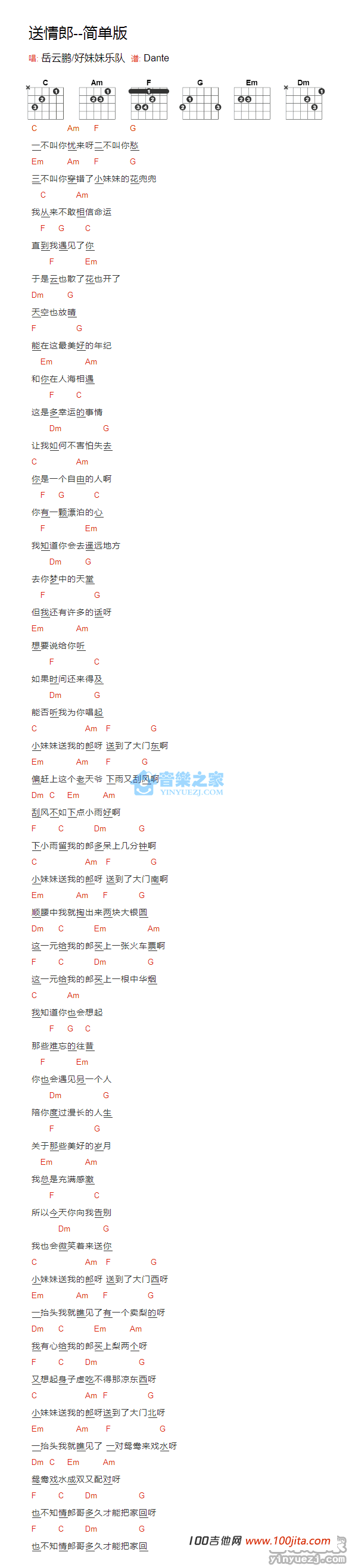 吉他送情郎吉他谱_岳云鹏_C调吉他弹唱谱六线谱